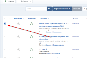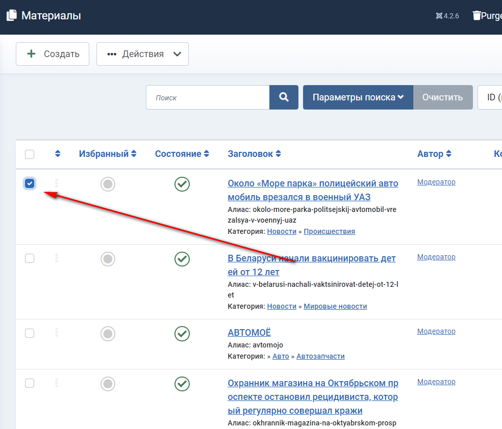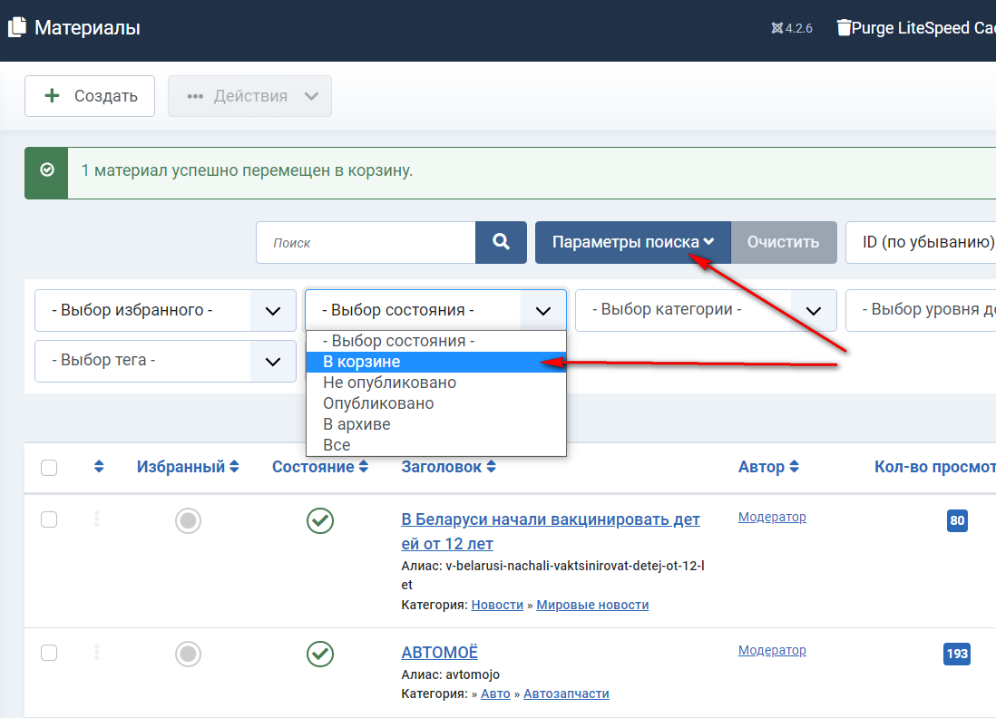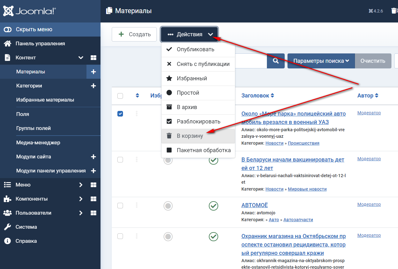 Тут все просто. Переходим Контент/Материалы. Далее выделяем не нужный материал, нажимаем Действия и отправляем материал в Корзину.