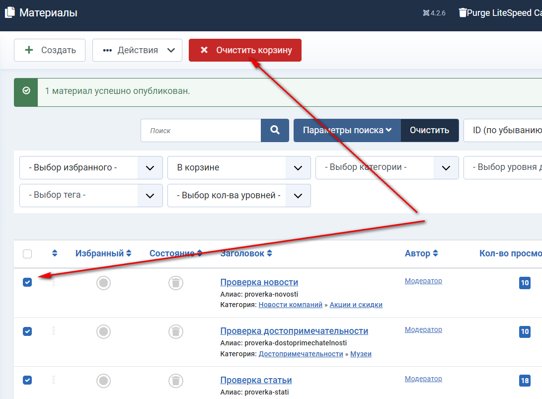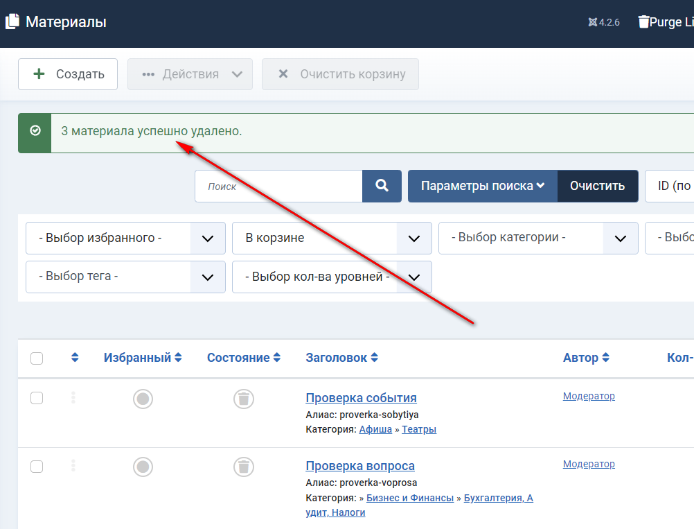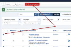 Далее выбираем материалы, которые нужно удалить и нажимаем Очистить корзину. Далее соглашаемся с предупреждением об удалении и видим, что, выбранные, материалы успешно удалены.