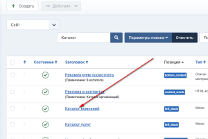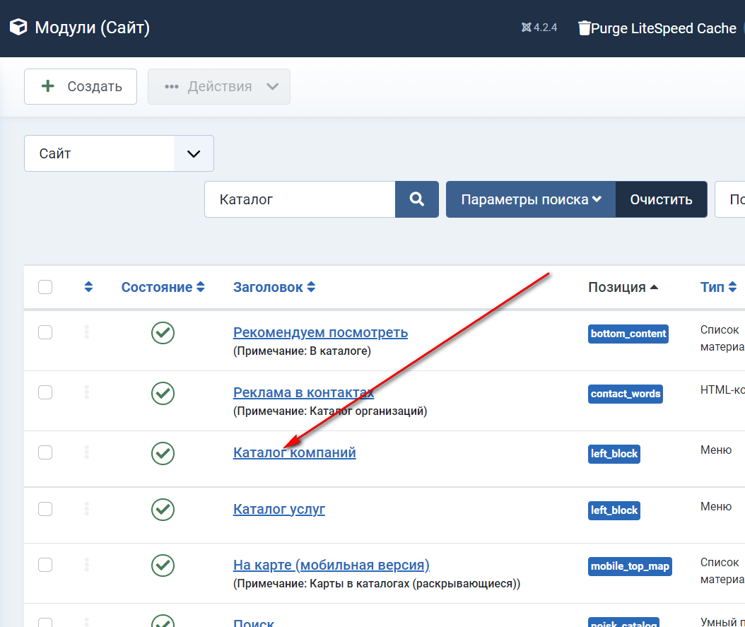 На примере модуля Каталог компаний, я покажу как поменять иконку у заголовка модуля. Переходим Контент/Модули сайта. Находим модуль Каталог компаний и открываем его. Переходим на вкладку Дополнительные параметры.