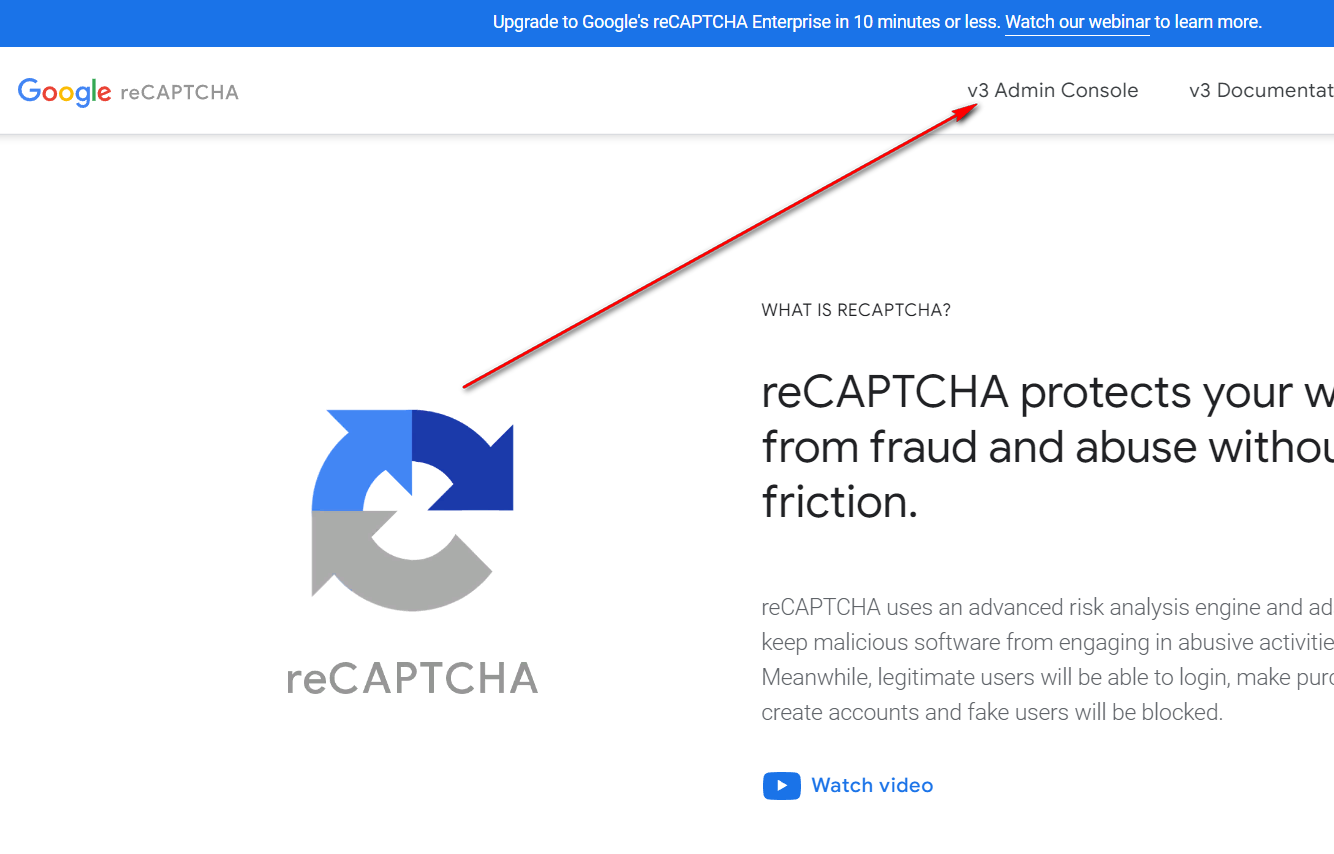Что бы получить ключи Вам необходим аккаунт в Google, поэтому если его нет первым делом регистрируемся там. Далее переходим на сайт reCaptcha. В верхнем правом углу нажимаем Admin Console.