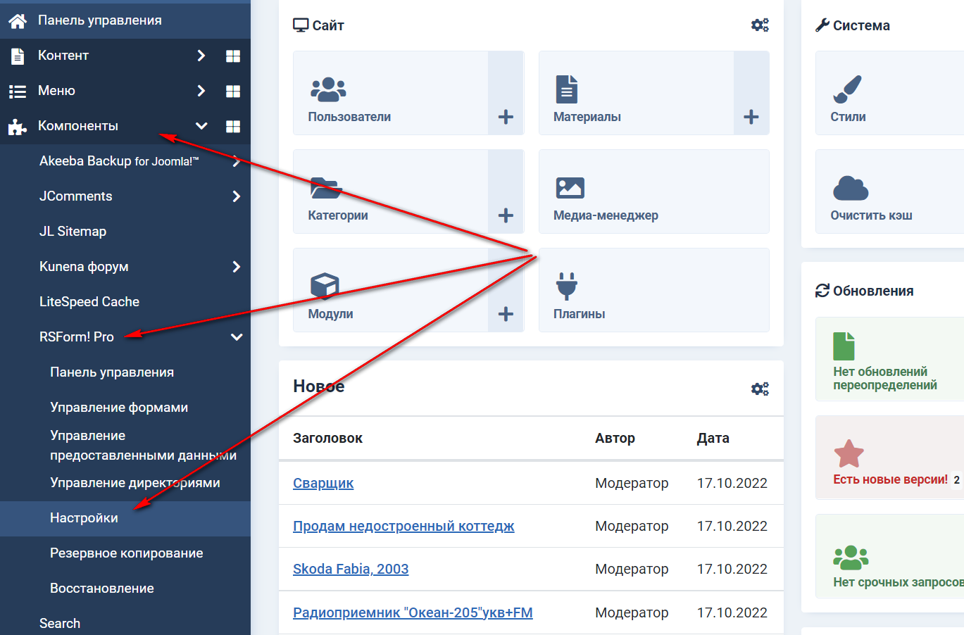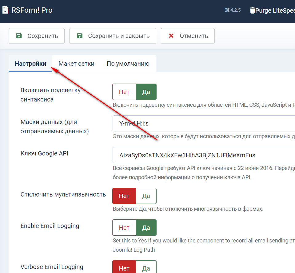 Далее переходим Компоненты/RS Form/Настройки. На вкладке Настройки введите ключи, которые только что получили.
