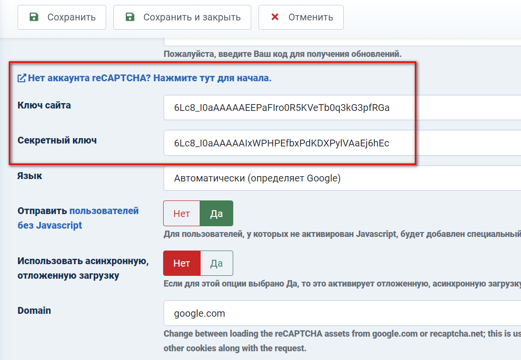 Для корректной работы каптчи (защиты от спама) необходимо получить ее открытый и секретный ключи. Это необходимо делать для любого нового доменного имени.