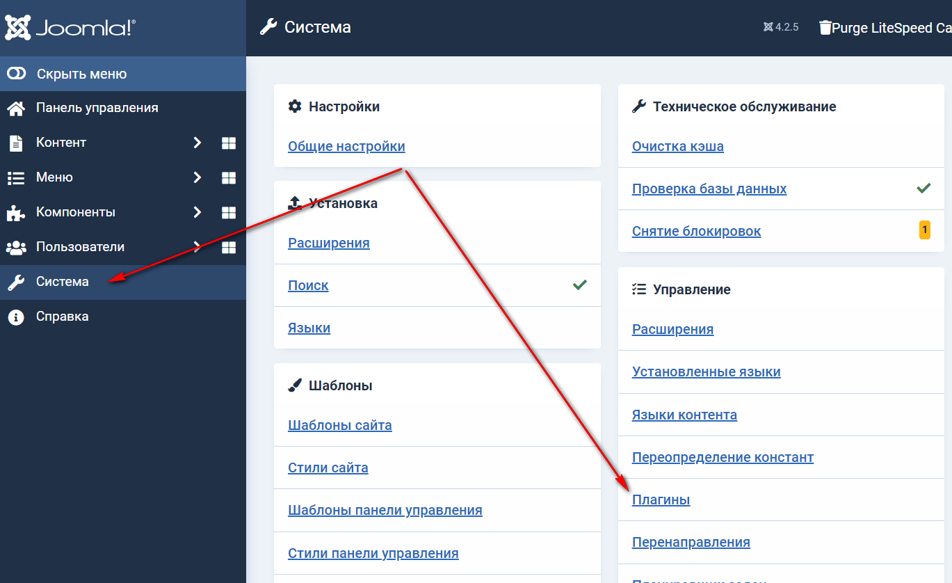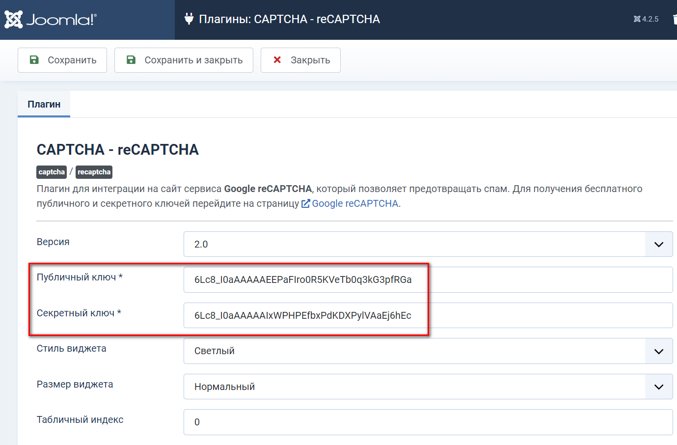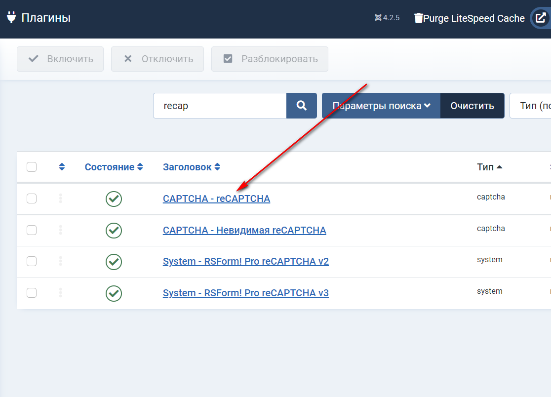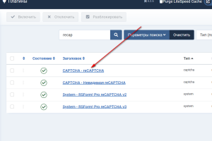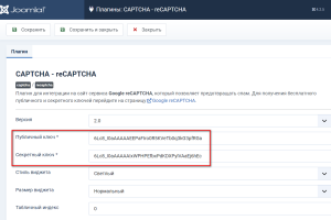 Переходим Система/Плагины. Открываем плагин reCaptcha и вводим еще раз, полученные, ключи
