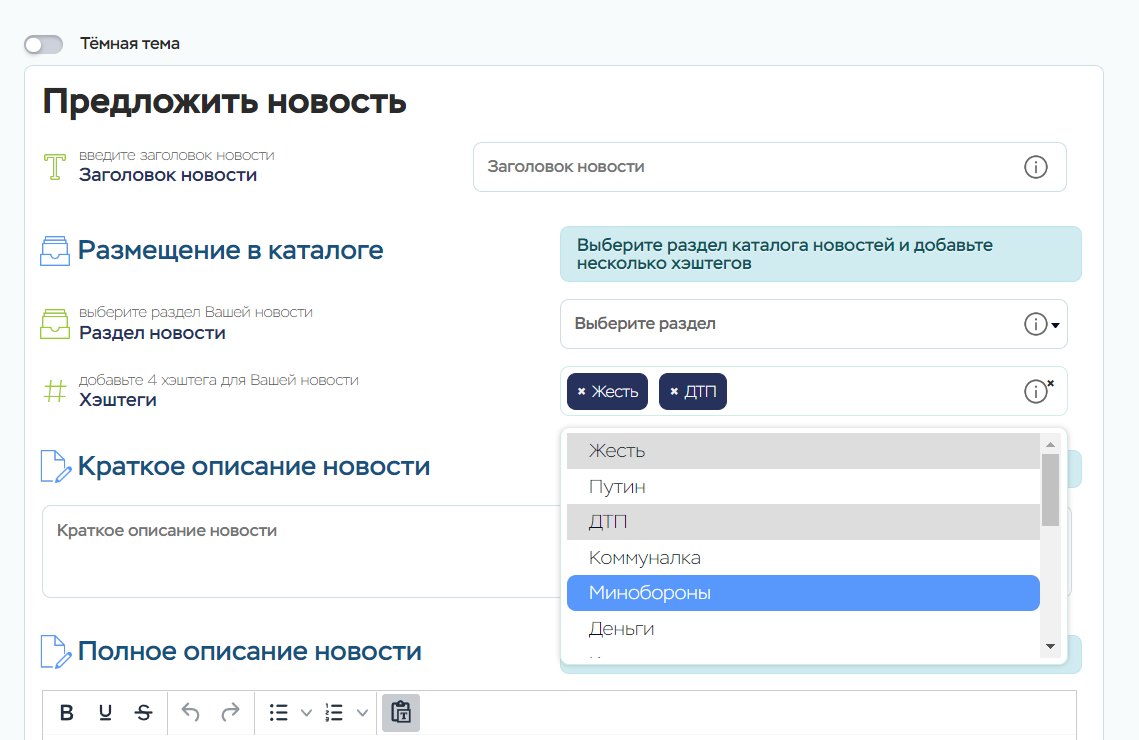 Особенностью портала является то, что хэштеги должен добавлять администратор сайта, и только после этого пользователи могут выбирать их из общего списка. Так же хештеги различаются по разделам, то есть для каждого отдельного раздела свои отдельные хэштеги и они ни как между собой не пересекаются.
