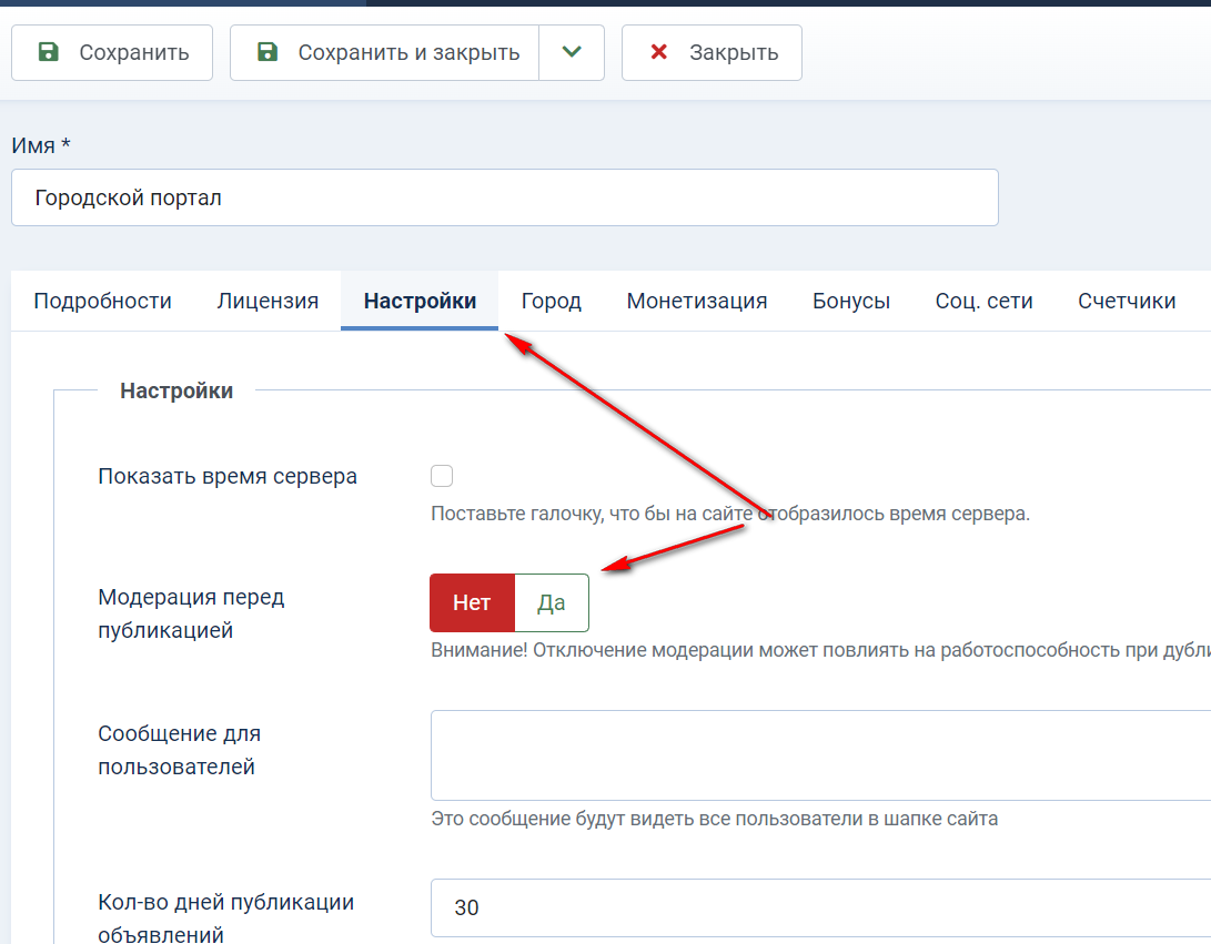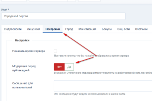 Что бы включить или выключить модерацию нужно перейти Панель управления/Стили и открыть шаблон Городской портал. На вкладке Настройки есть переключатель Модерация перед публикацией.