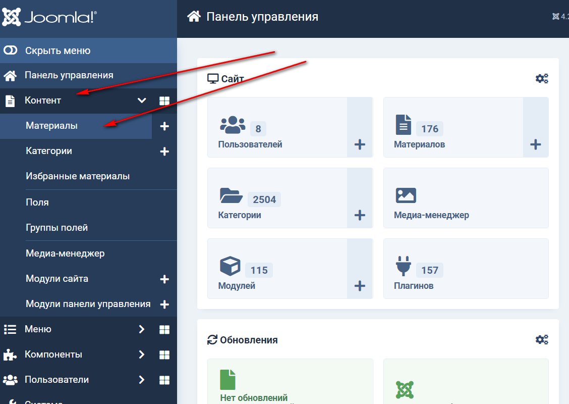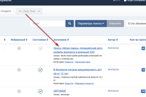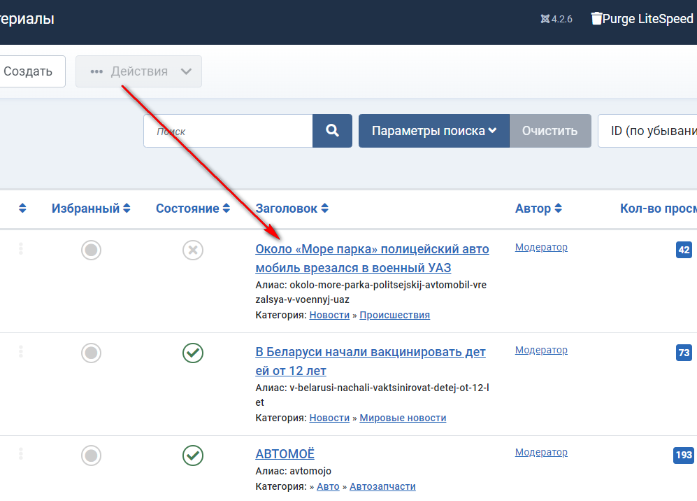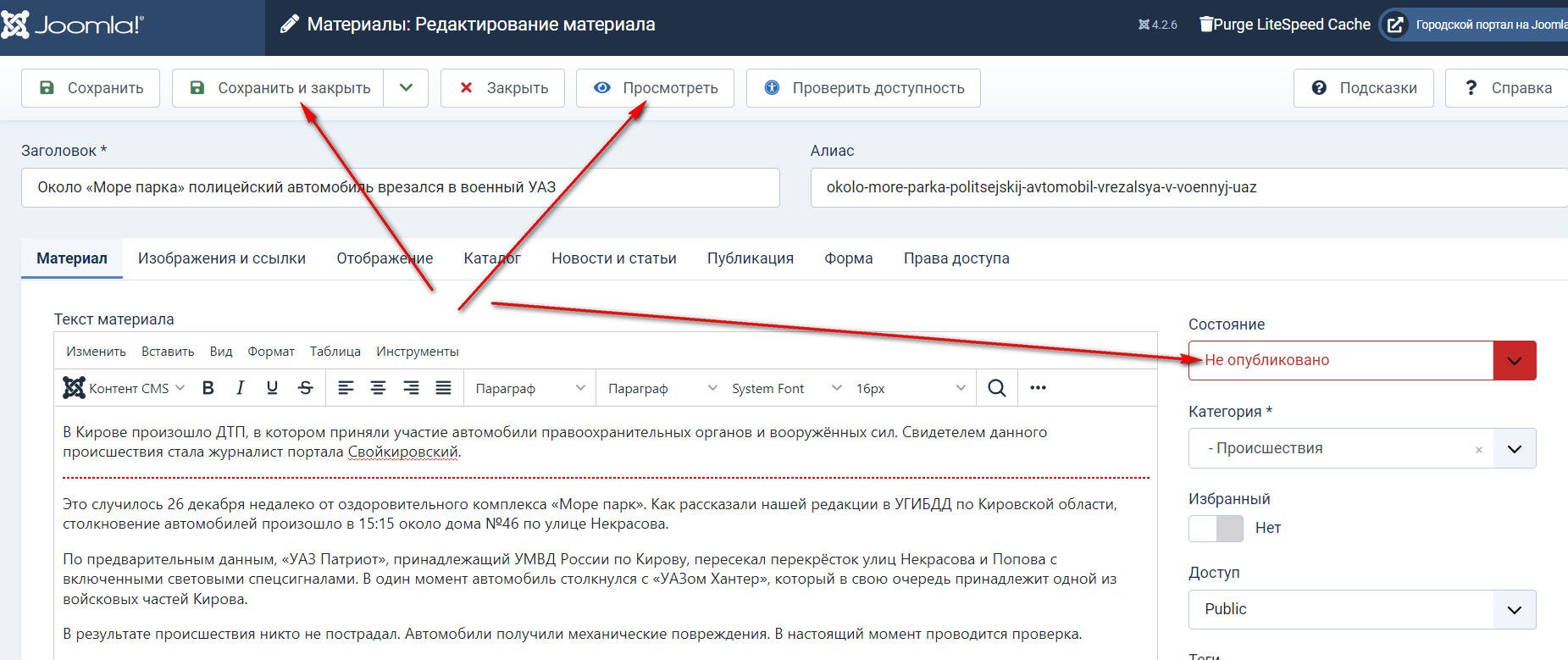 Для этого нужно перейти Контент/Материалы. Открыть неопубликованный материал (все не опубликованные материалы помечены серыми крестиками). Просмотреть материал, как он отображается на сайте, проверить текст и изображения. И опубликовать материал.