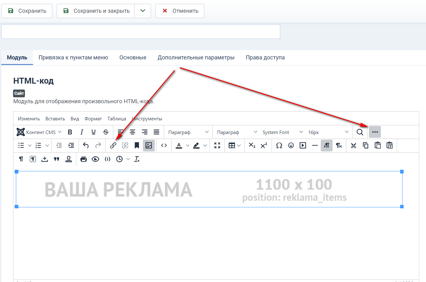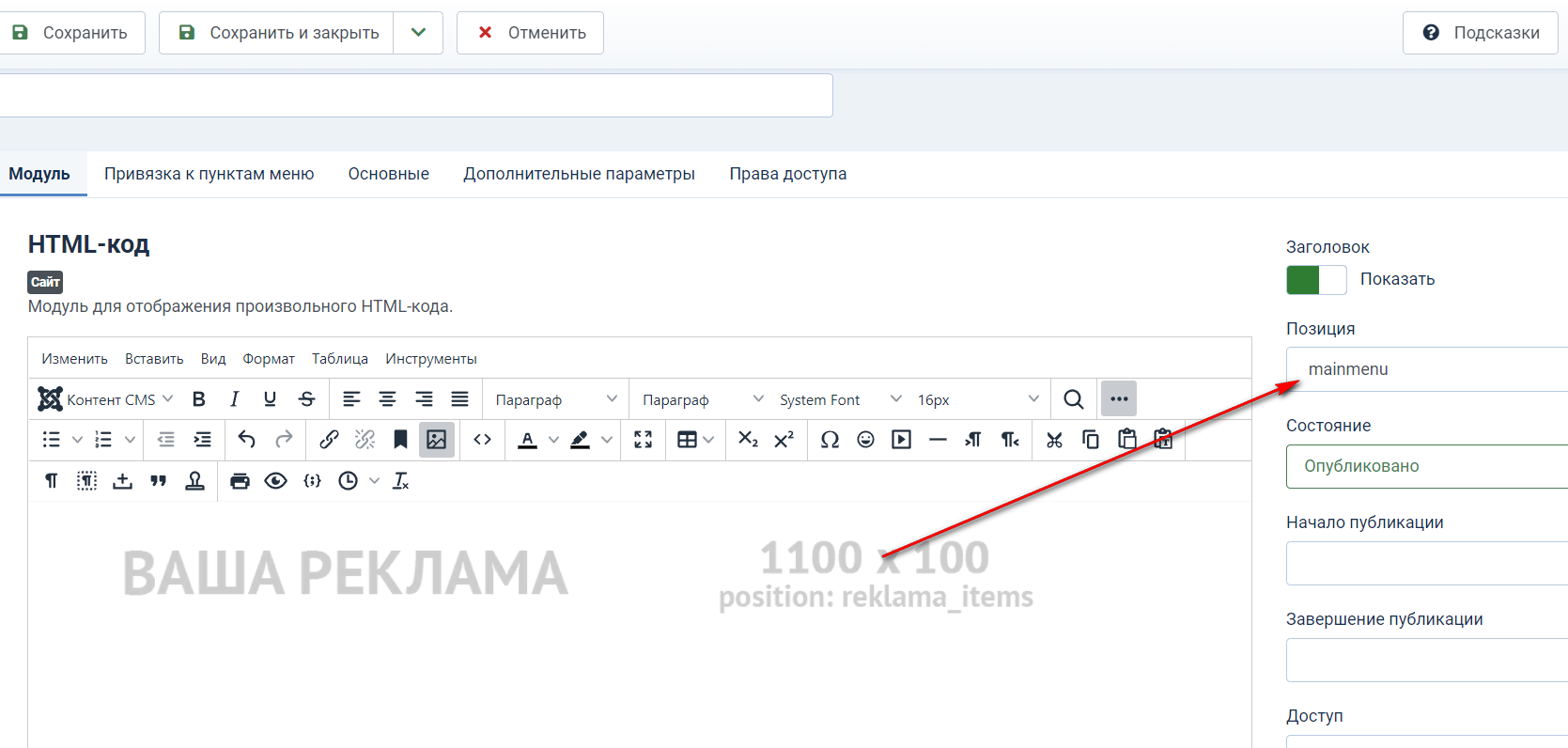 Далее прописать нужную позицию, а на вкладке Привязка к пунктам меню выбрать страницы, на которых модуль с рекламой должен отображаться.