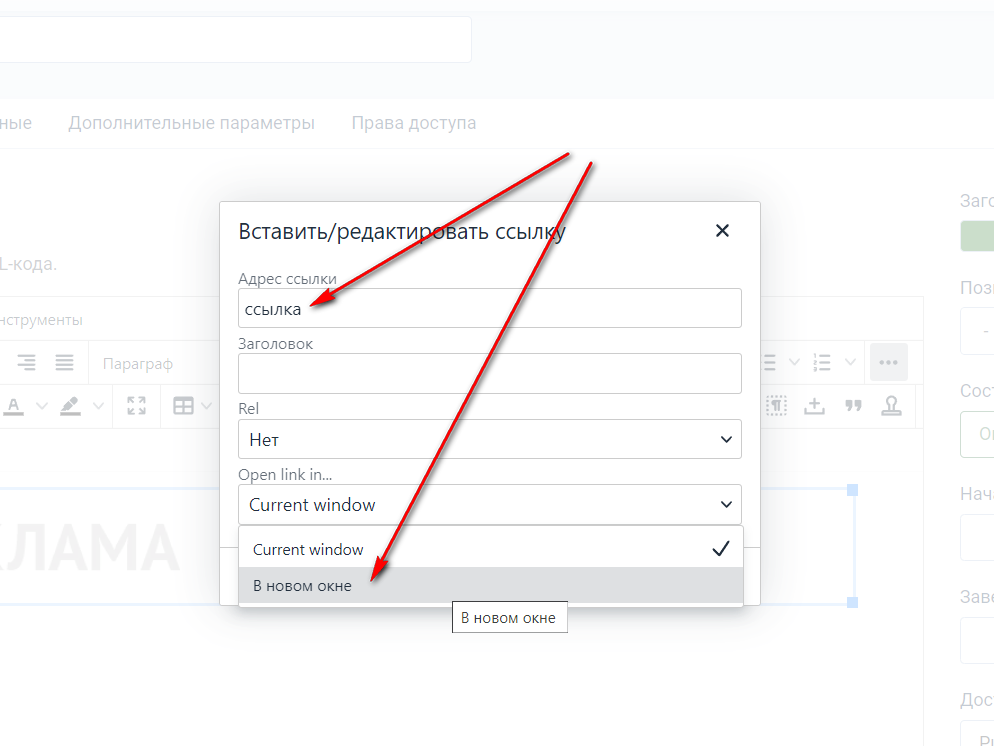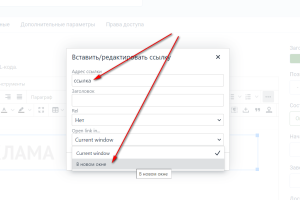 Далее прикрепить баннер, добавить ссылку (лучше в Новом окне, что бы ссылка открывалась в новой вкладке браузера).