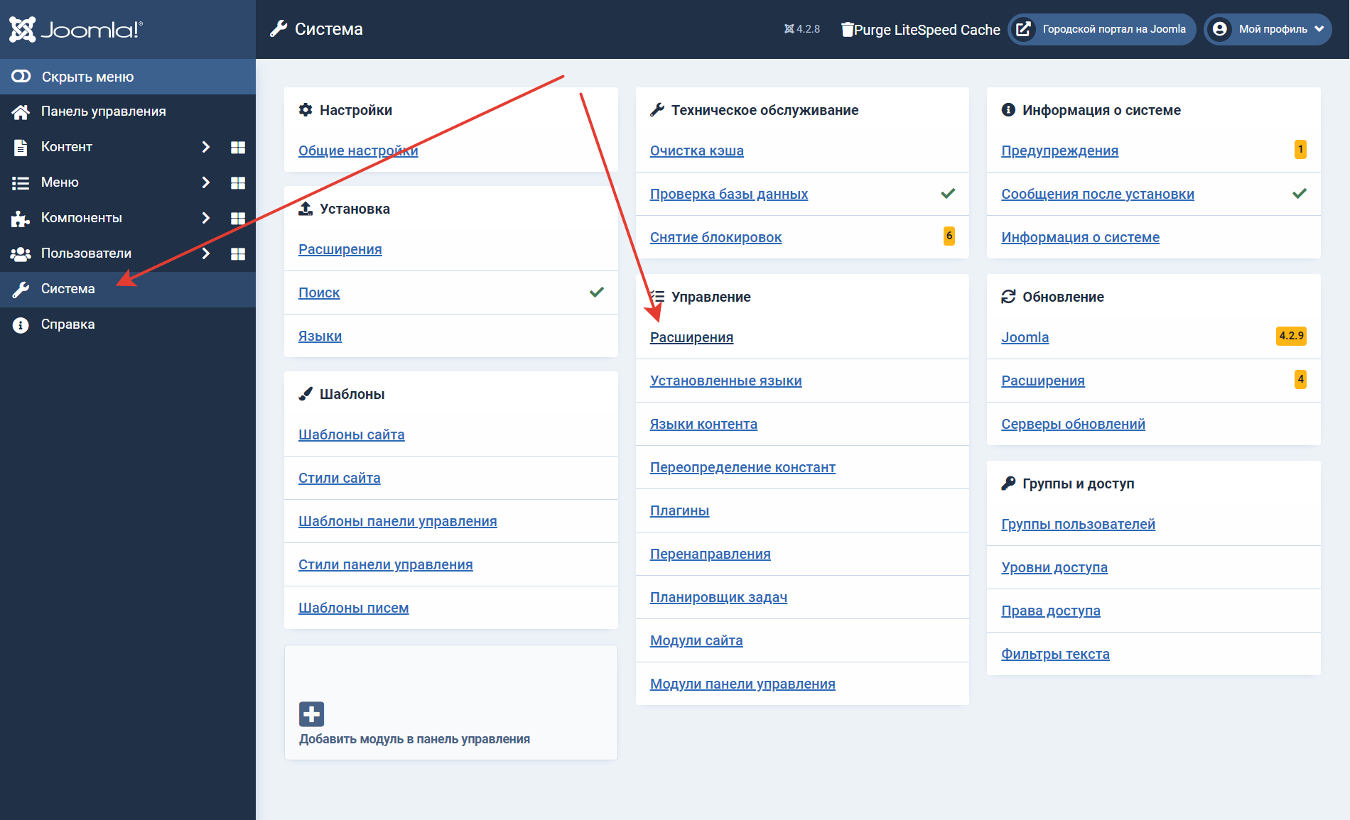 - Перейдите Система/Установка расширений. Перейдите на вкладку Загрузить и установить. Перетащите в поле для загрузки архив gorod.zip (находится в архиве с обновлением в папке Airus-1.0.0).