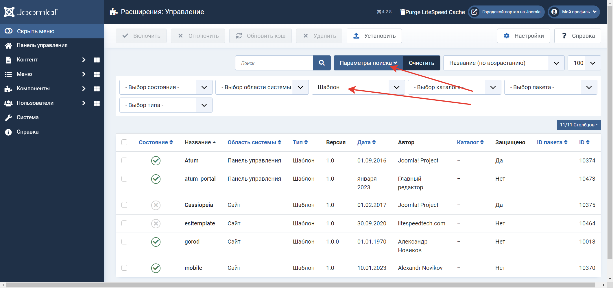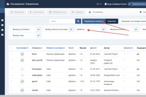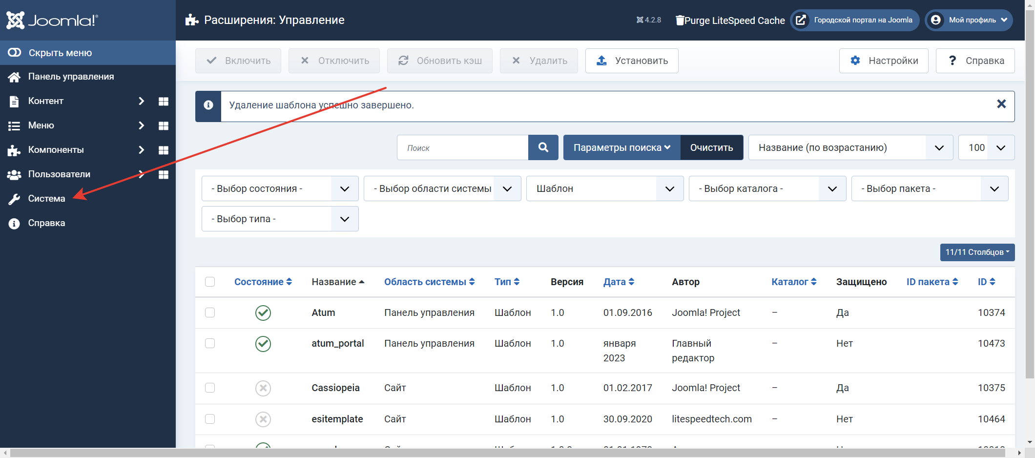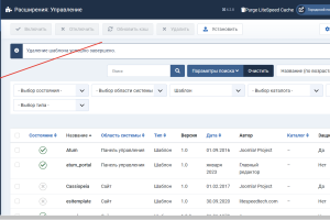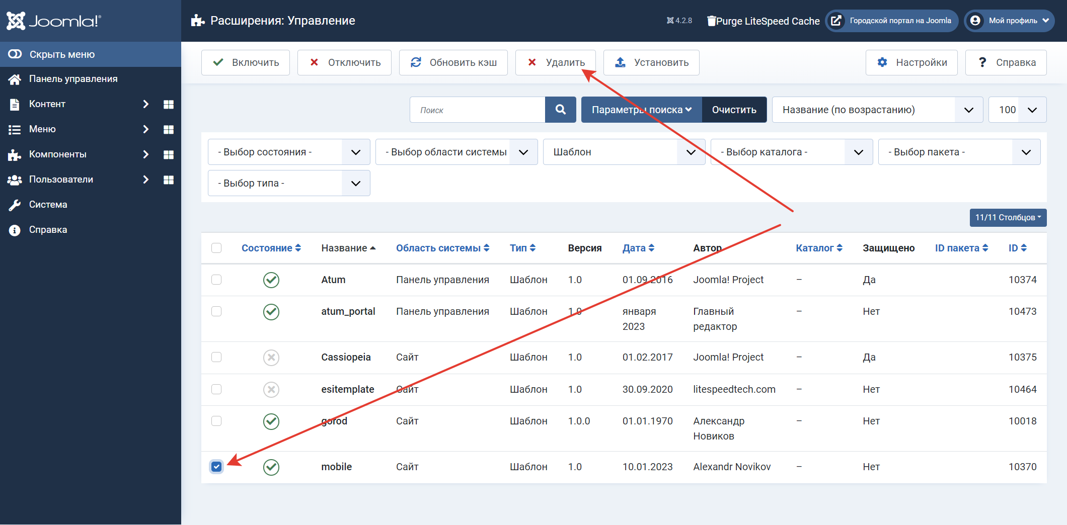 В новом шаблоне нам не нужен отдельный шаблон для мобильной версии, поэтому его нужно удалить. Для этого переходим Системы/Управление/Расширения. Отмечаем шаблон mobile и Удаляем его.