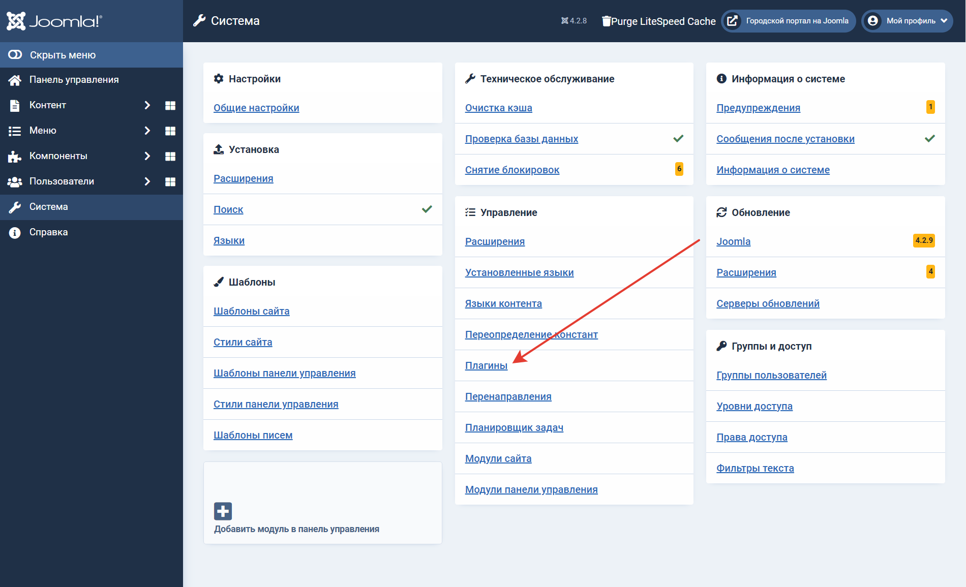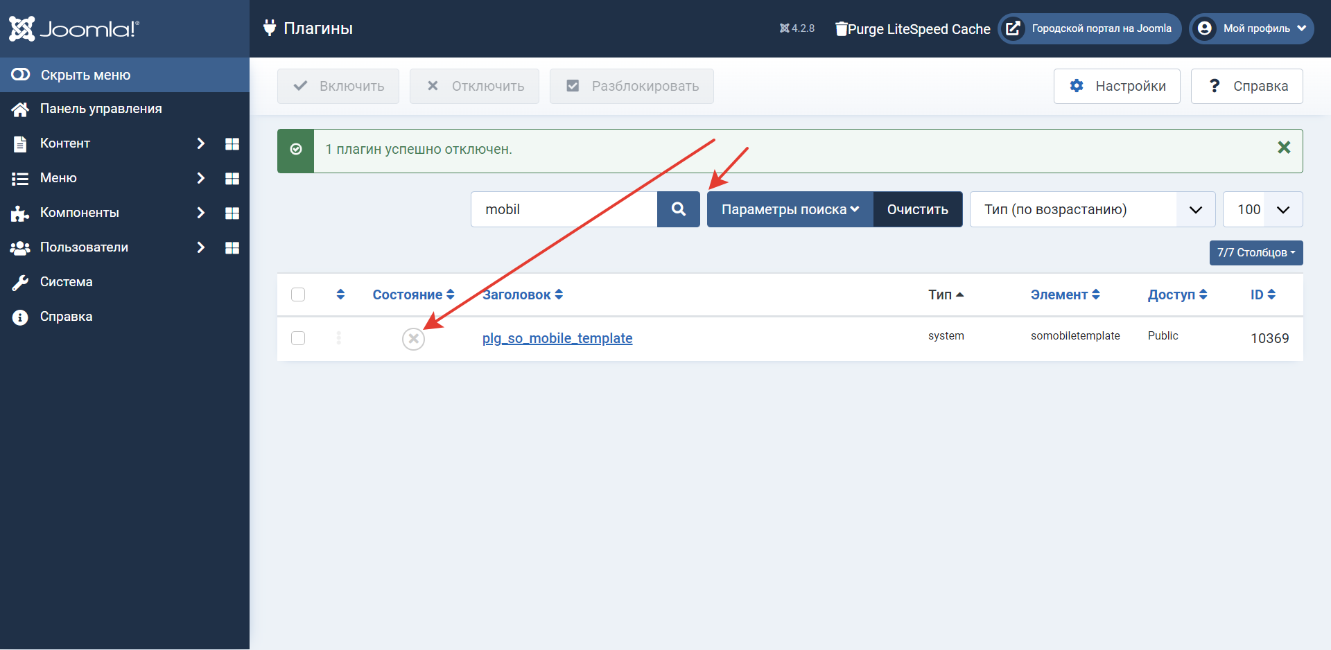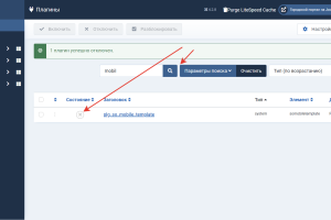 Далее переходим Система/Плагины и находим плагин plg_so_mobile_template и Выключаем его.
