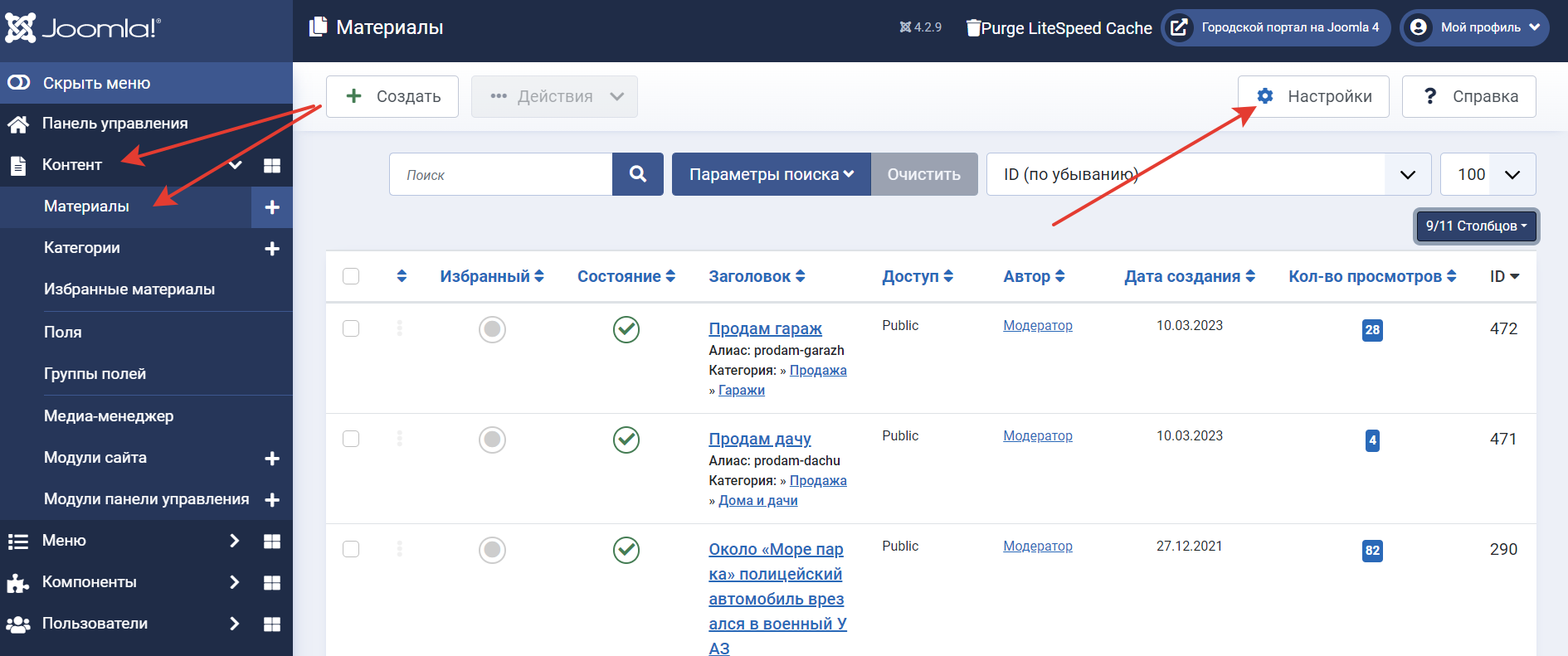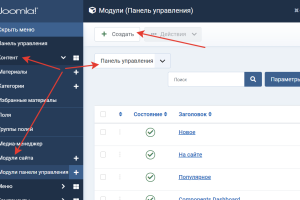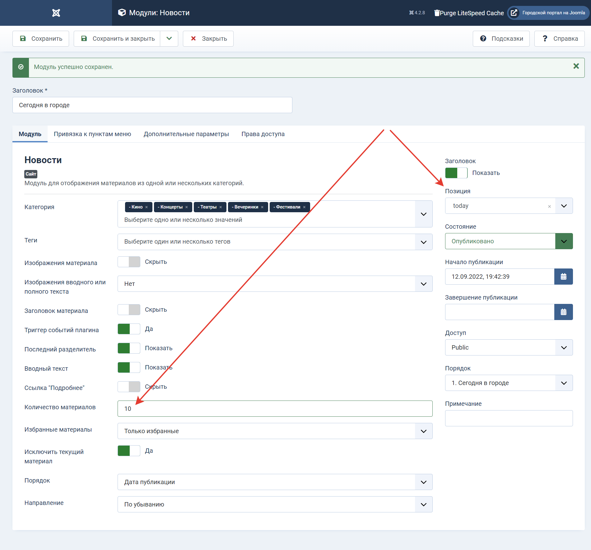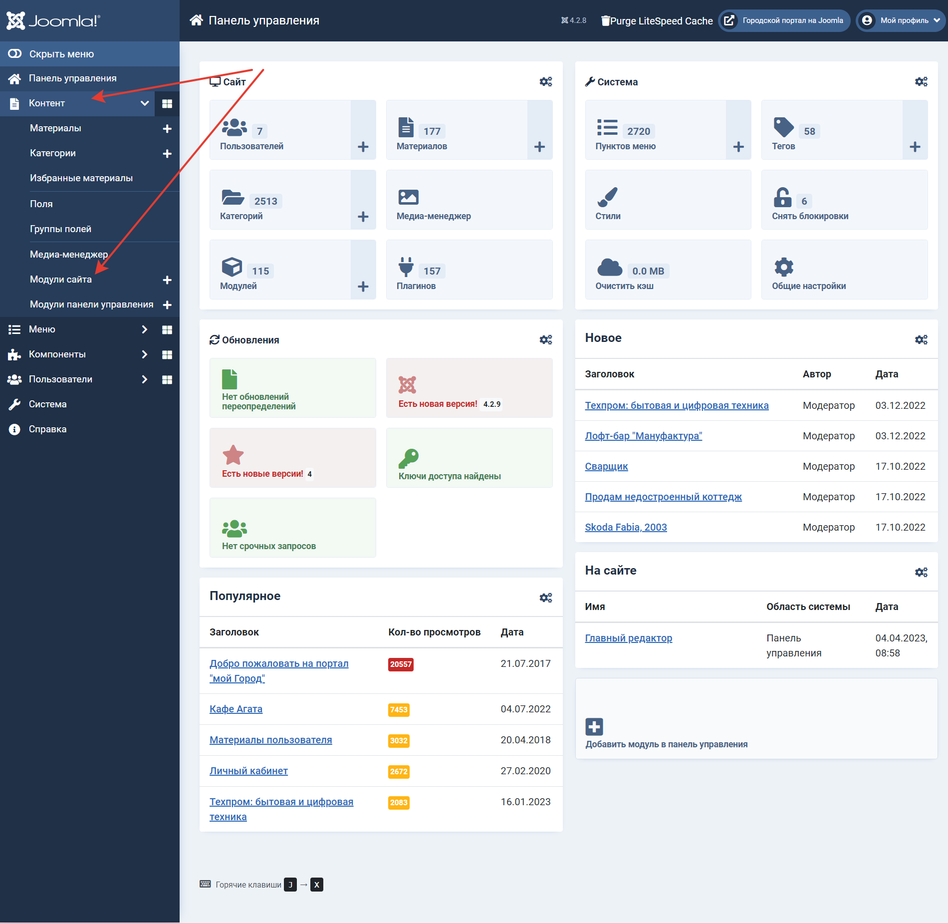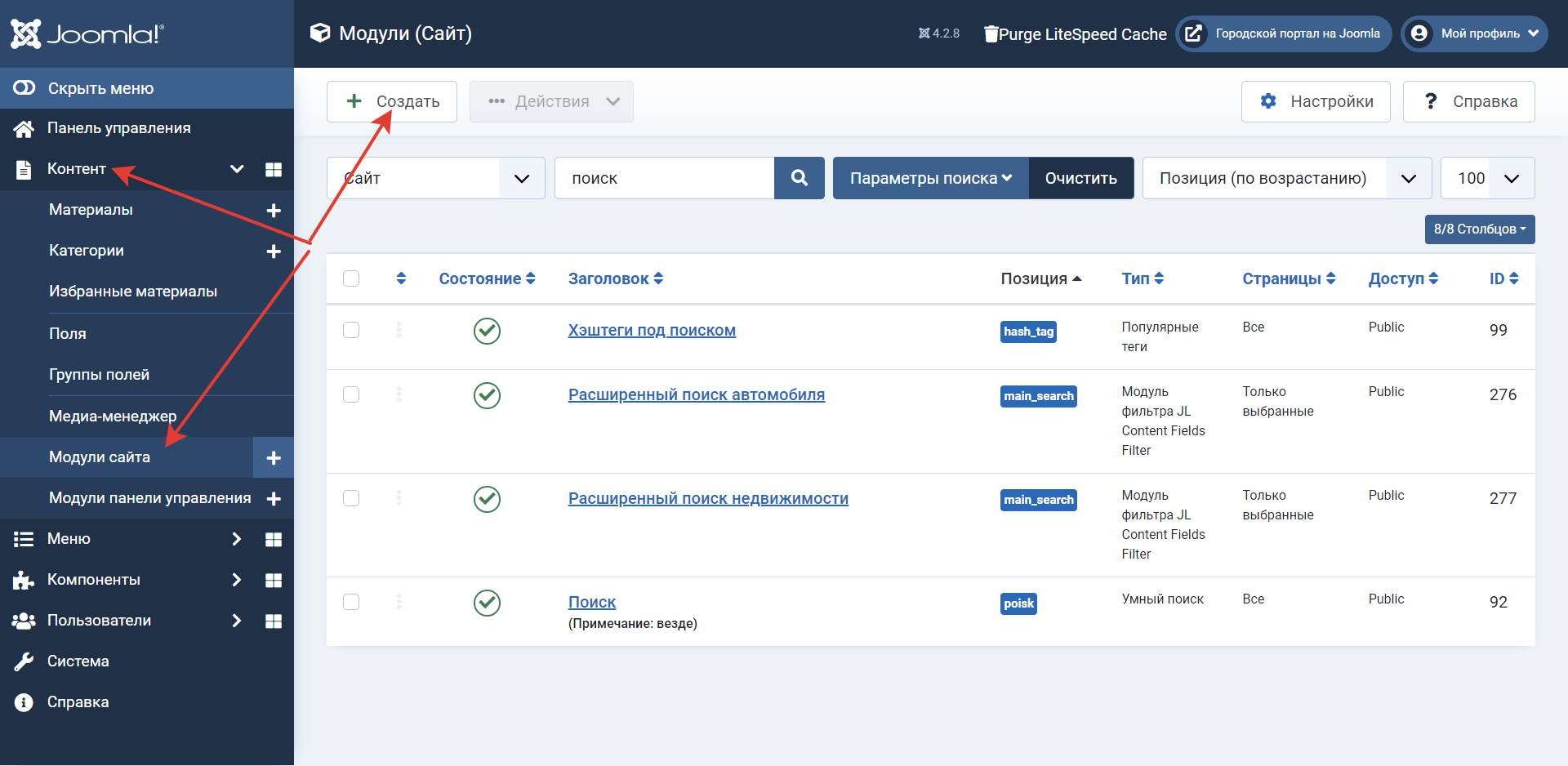 Теперь переходим Контент/Модули сайта и по-порядку находим модули и меняем у них позиции, макеты вывода и количество выводимых материалов: