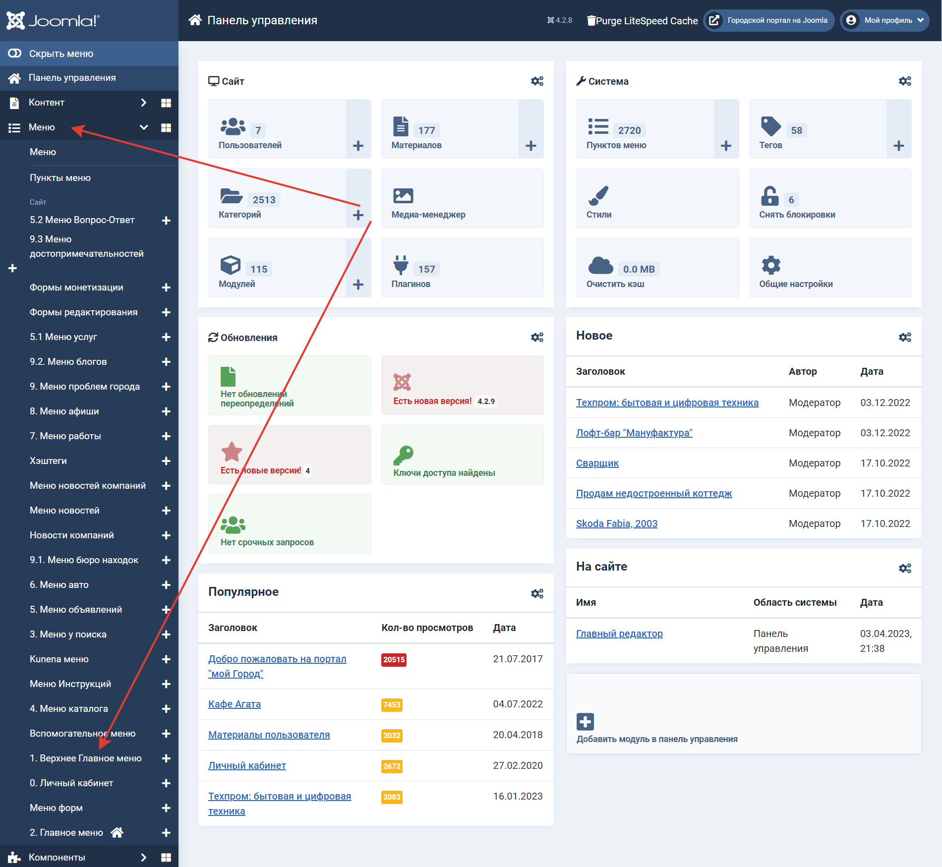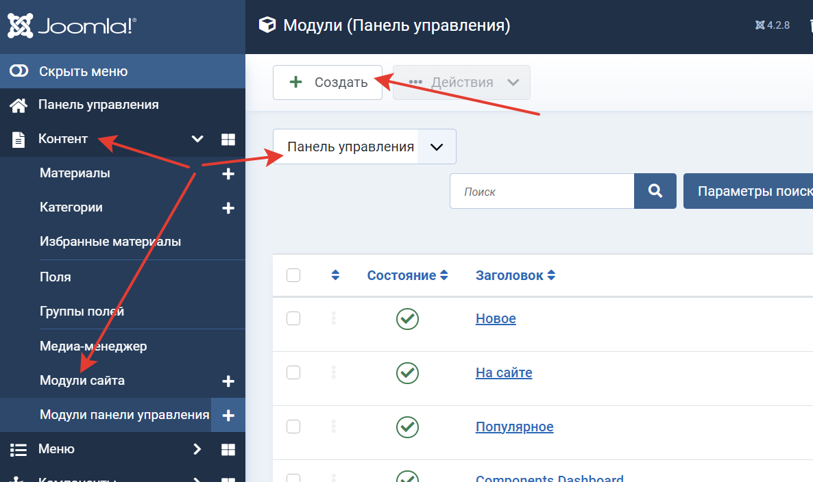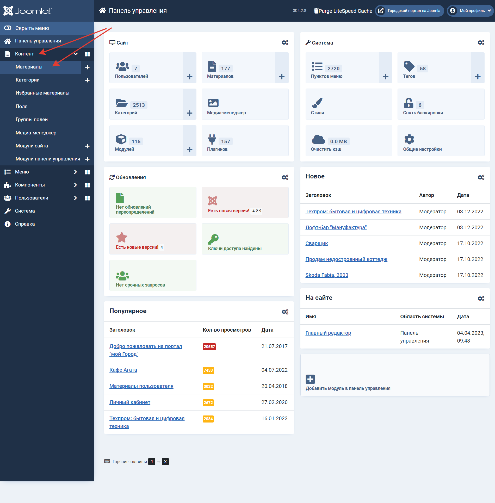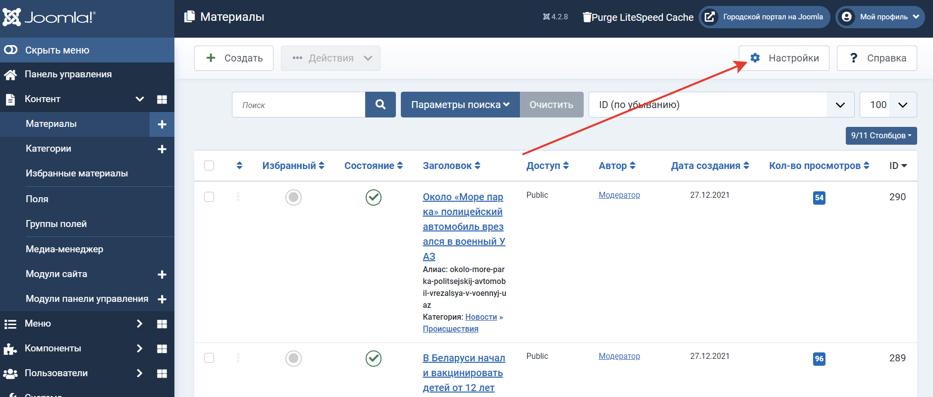 Теперь переходим Контент/Модули сайта и по-порядку находим модули и меняем у них позиции, макеты вывода и количество выводимых материалов: