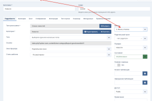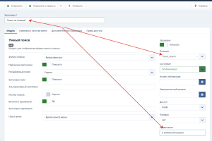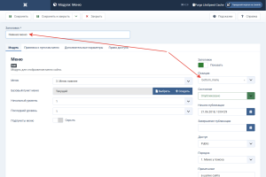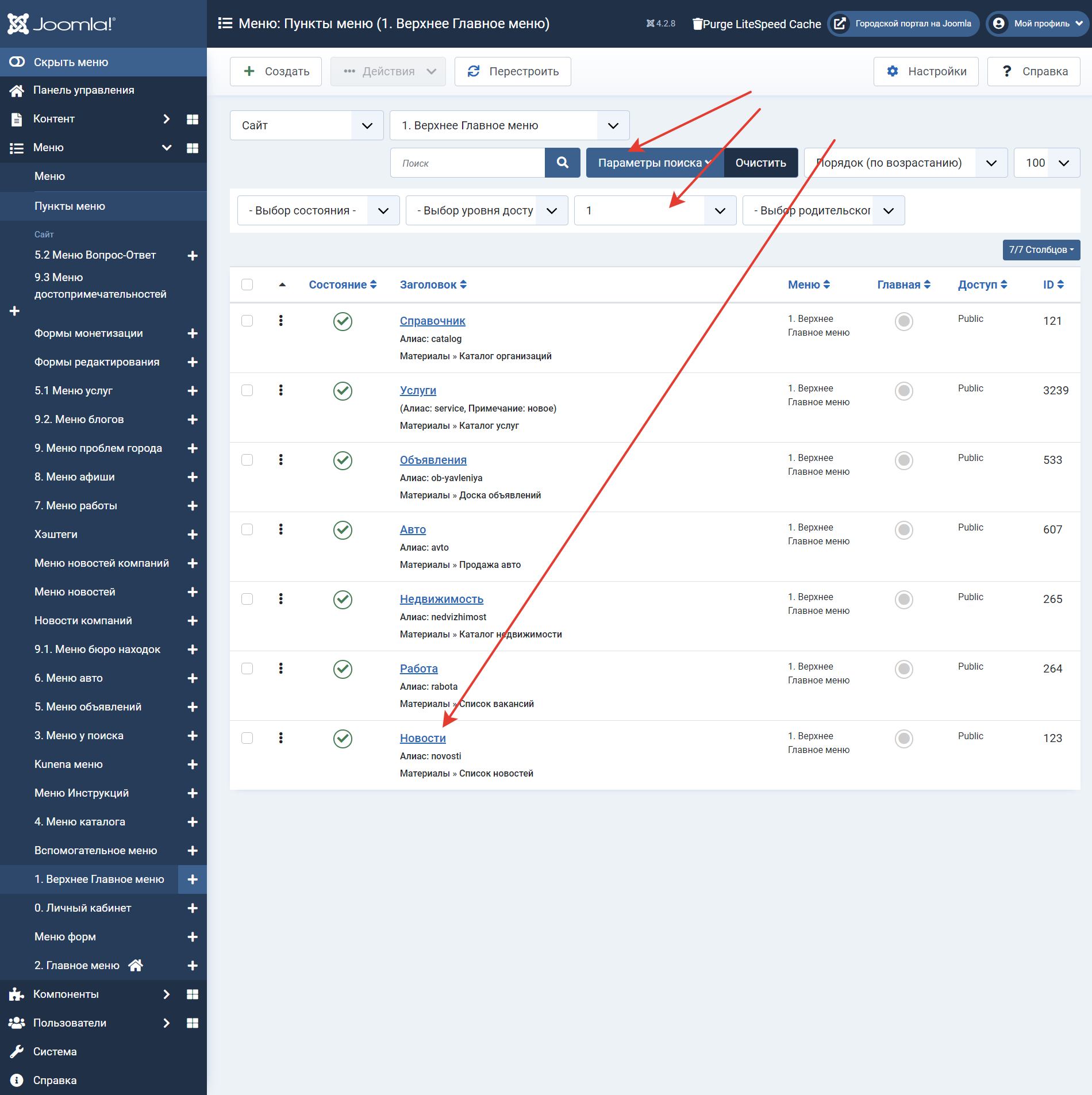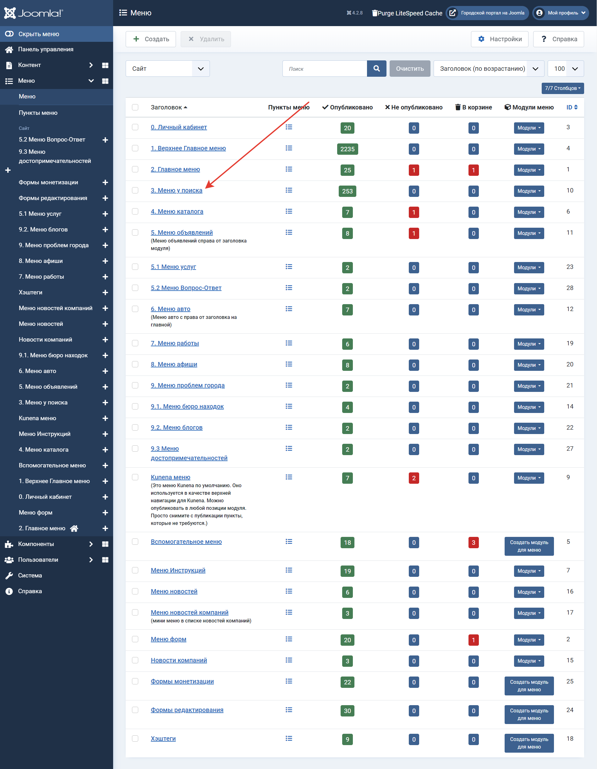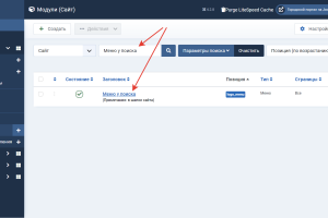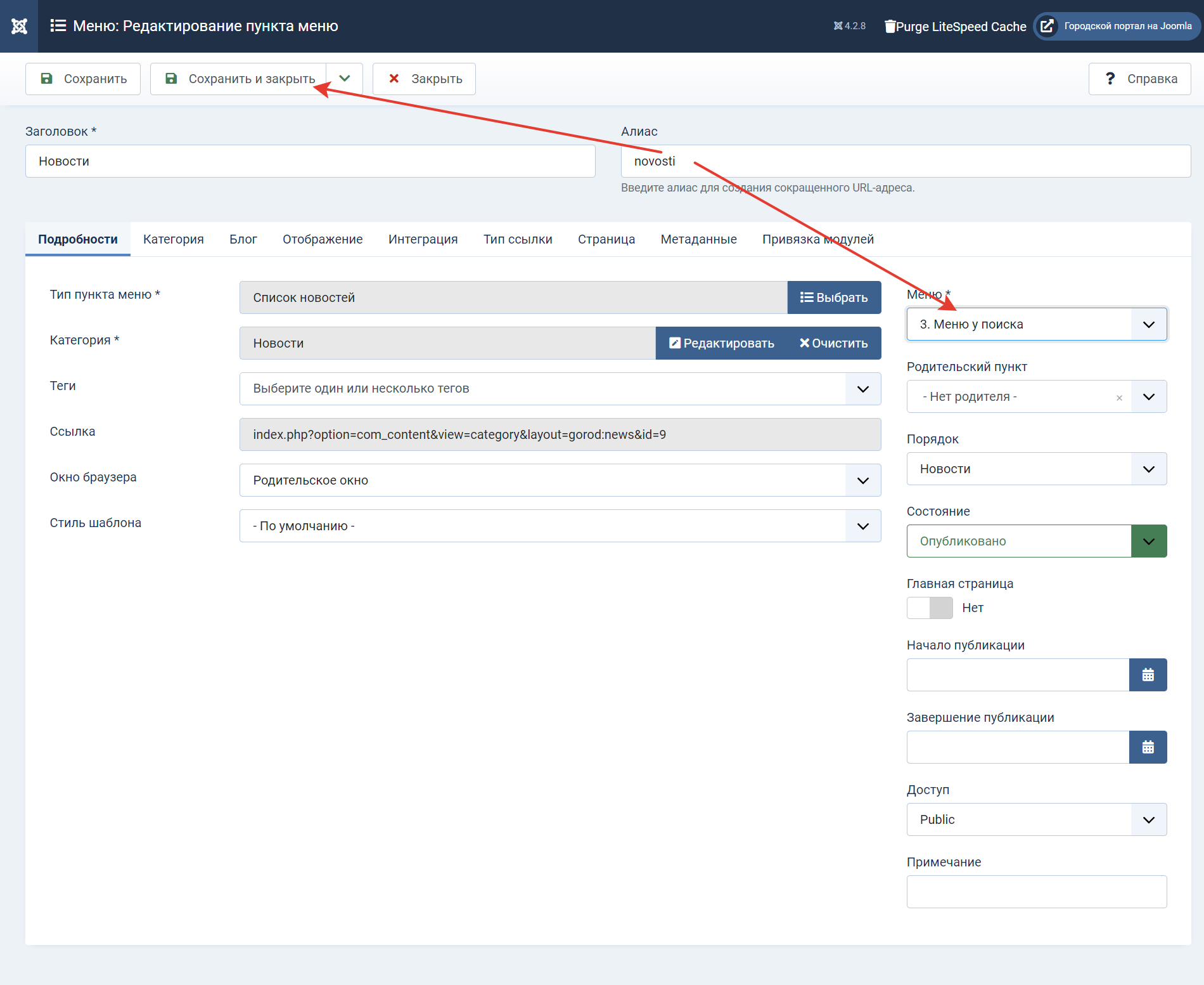 Для начала перенесем пункт меню Новости в другое меню. Для этого переходим Меню/Верхнее главное меню. Находим пункт Новости, открываем его и меняем меню на 3. Меню у поиска.