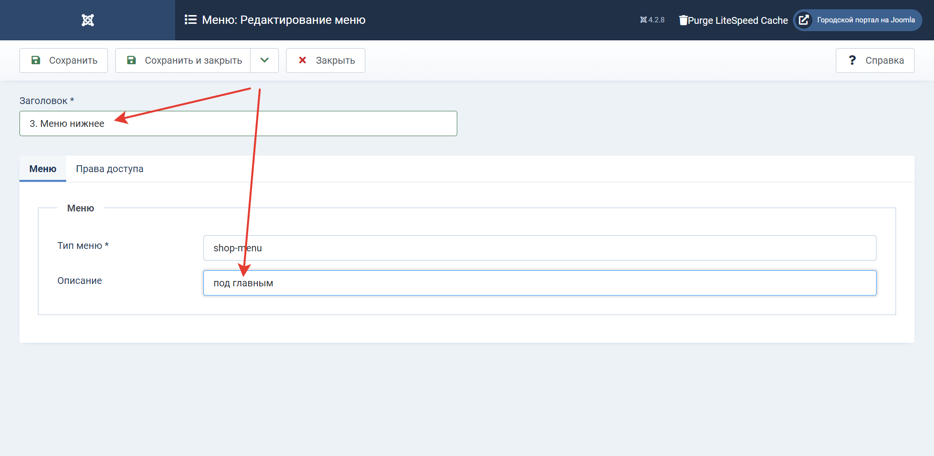 Далее переходим Меню/Меню, открываем Меню у поиска и переименовываем его в Меню нижнее