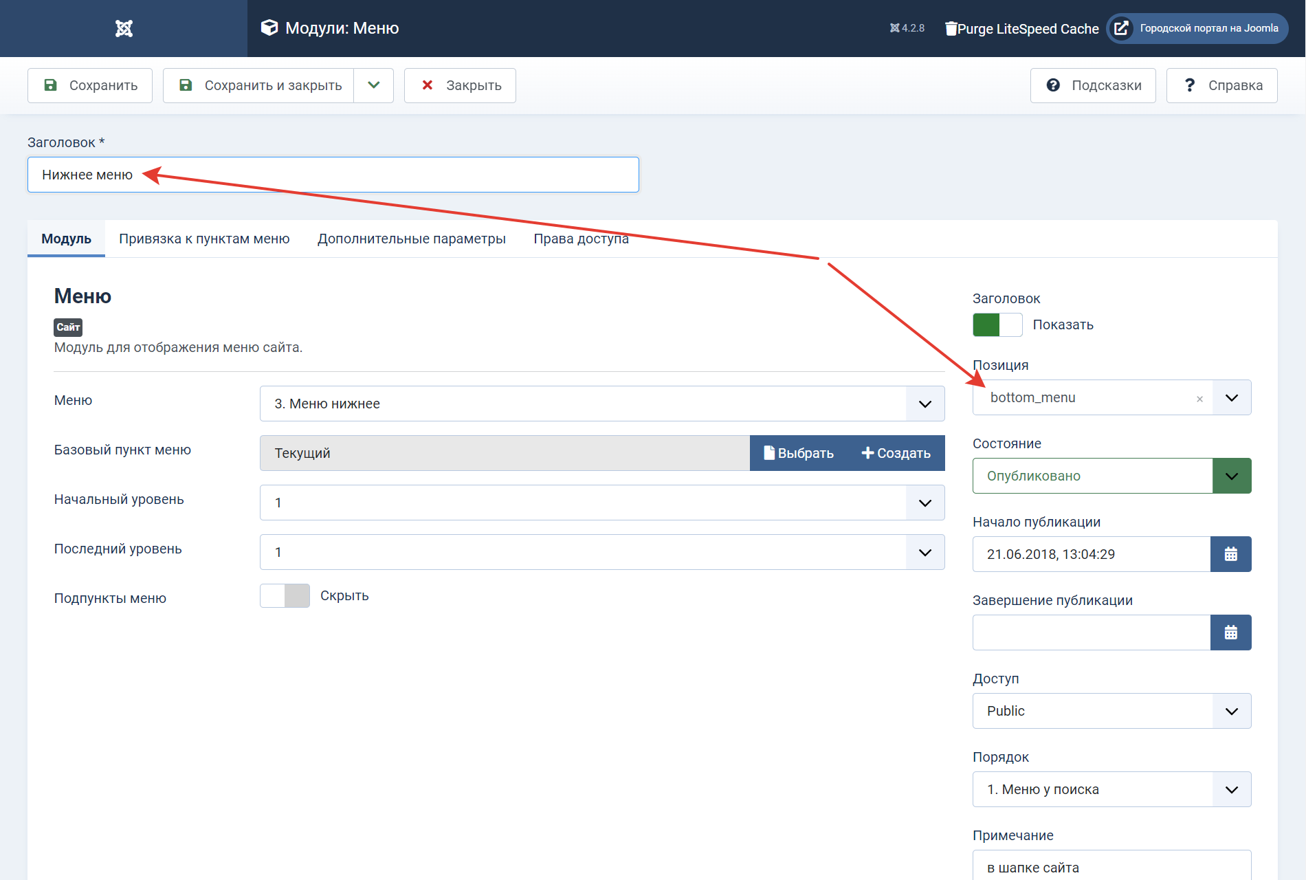 Переходим Контент/Модули сайта, находим модуль Меню у поиска, меняем у него позицию на bottom_menu и переименовываем его в Нижнее меню.