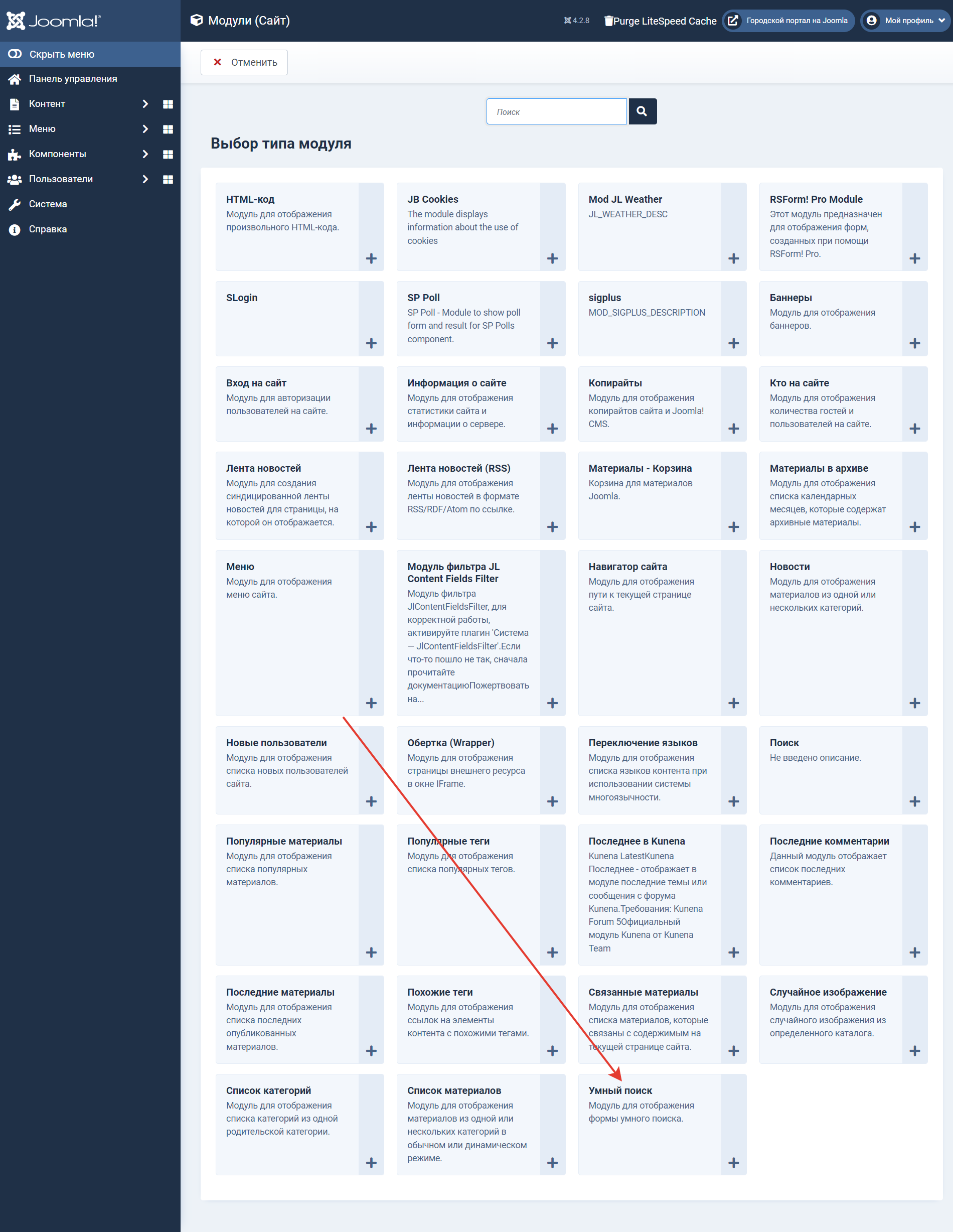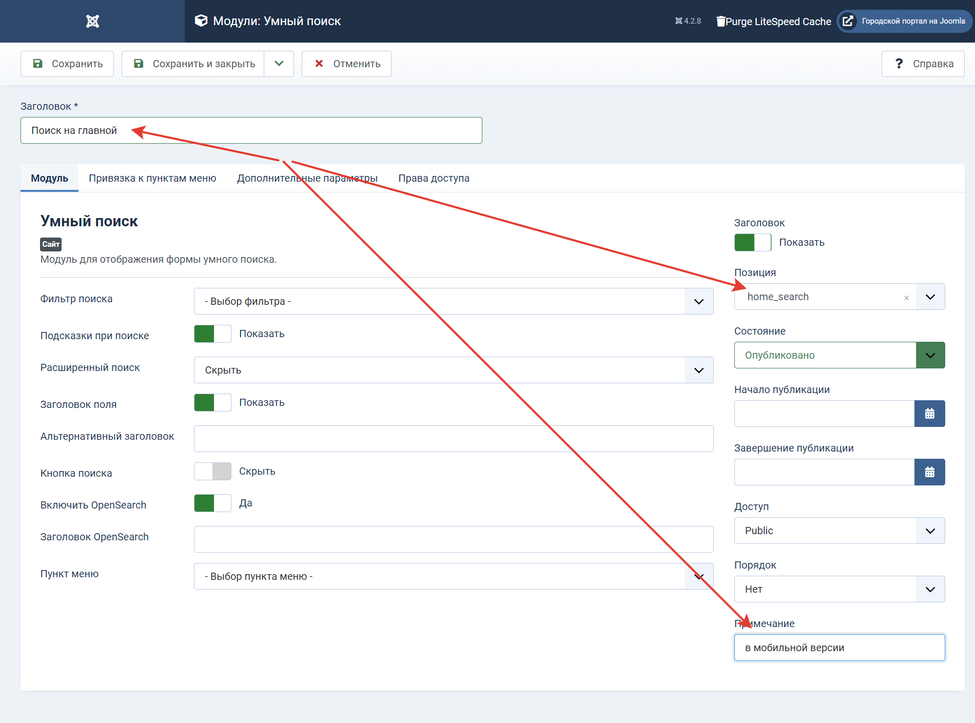 Переходим Контент/Модули сайта и создаем новый модуль с типом Умный поиск. Даем ему наименование, позицию модуля указываем home_search и добавляем примечание. Так же опубликовываем этот модуль только на главной странице (сделать это можно на вкладке Привязка к пунктам меню).