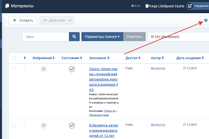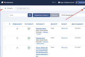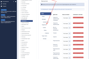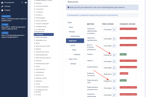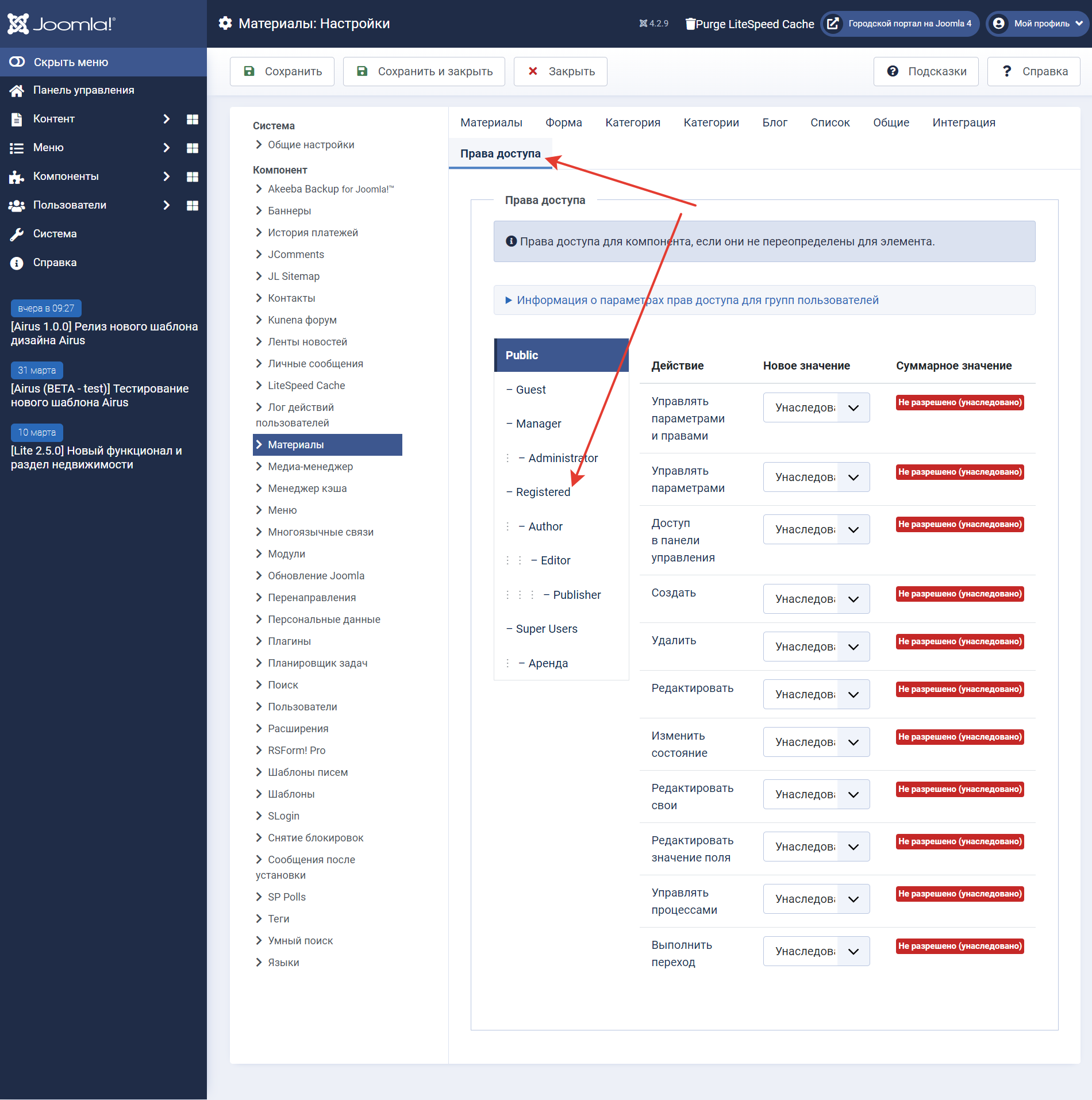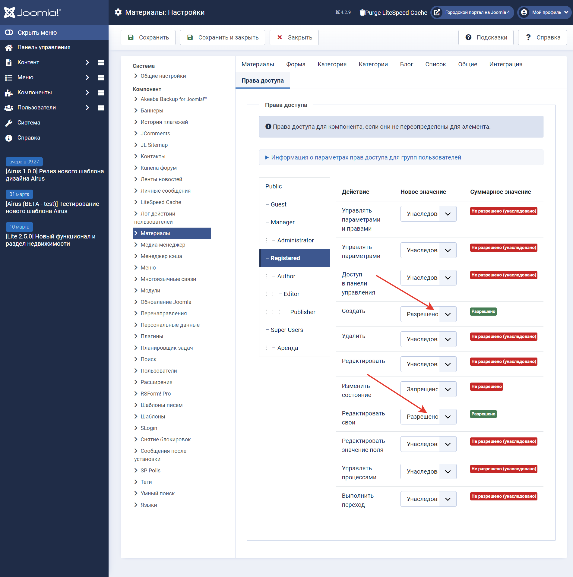 Для правильного отображения модерируемых материалов и материалов, у которых закончен срок публикации, нужно изменить права доступа. Для этого переходим Контент/Материалы, далее открываем Настройки и на вкладке Права доступа выбираем группу Registered. В настройках этой группы разрешаем Создавать и Редактировать свои.