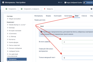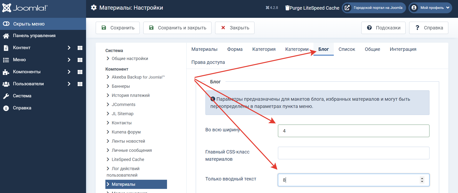 Теперь в мобильной версии материалы расположены в 2 колонки, поэтому нужно выводить количество материалов на странице кратное 2, что бы сайт не плыл. Для этого переходим Контент/Материалы, открываем настройки и на вкладке Блог выставляем Во всю ширину (это материалы до рекламного банера) и Только вводный текст (это материалы после рекламного банера). Числа можете ставить любые, но они должны быть кратны 2.