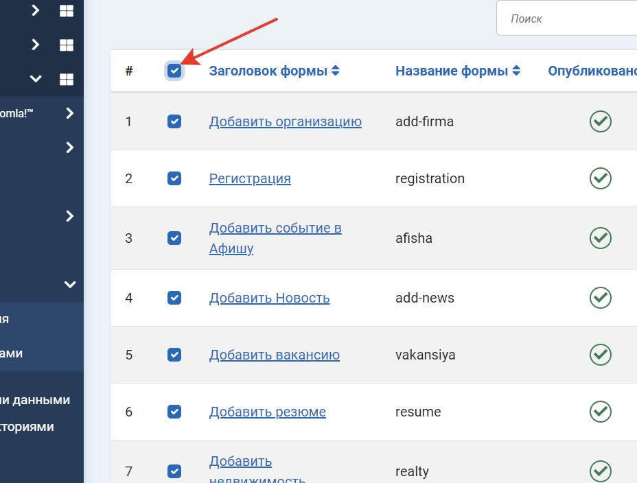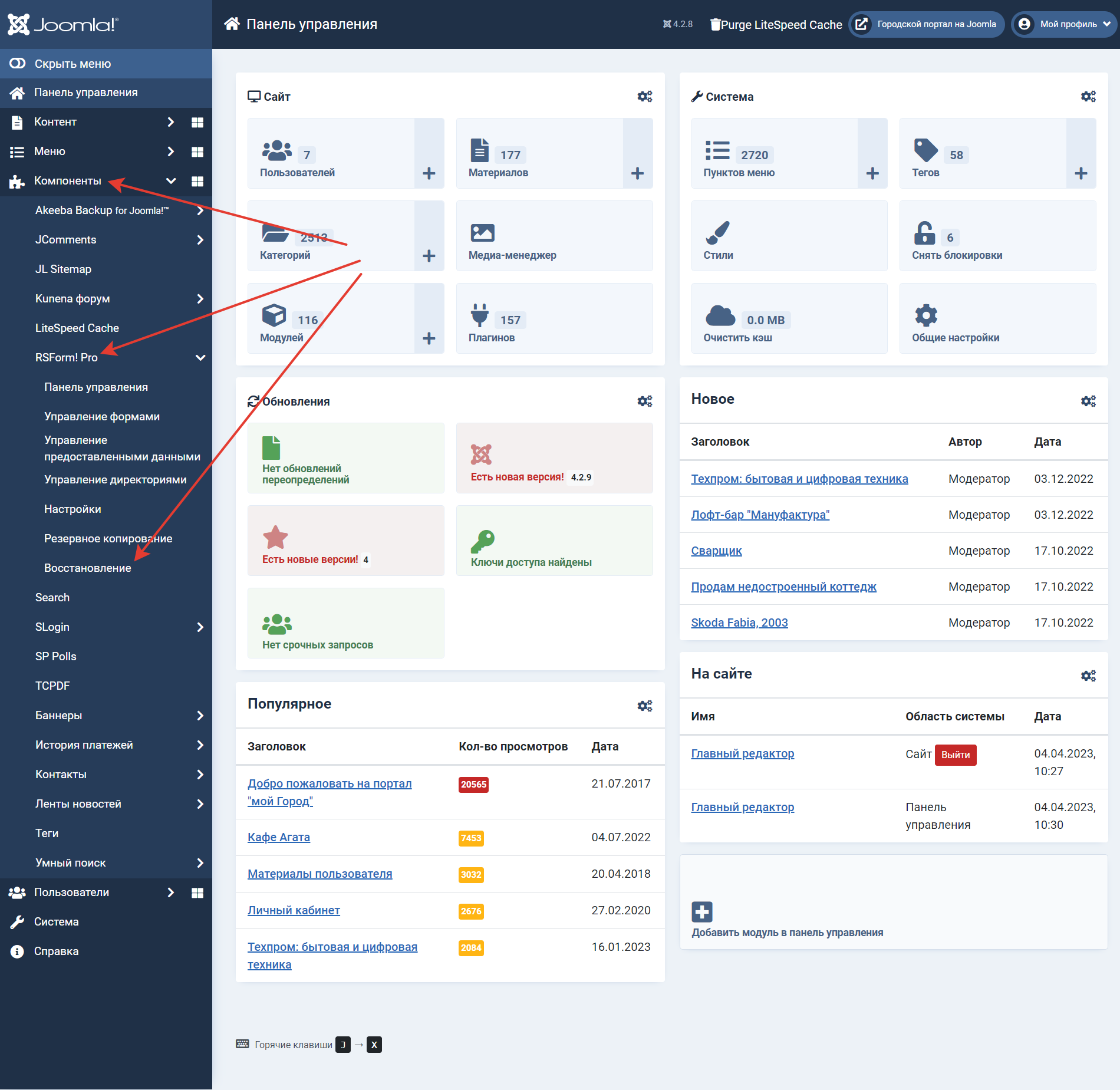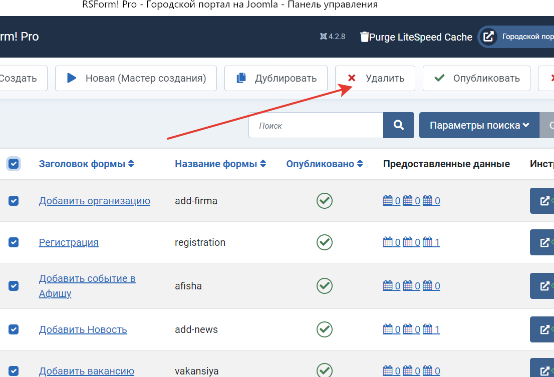 Переходим Компоненты/RS Form/Управление формами, отмечаем все формы и Удаляем их.