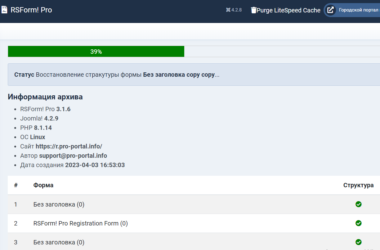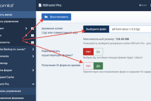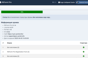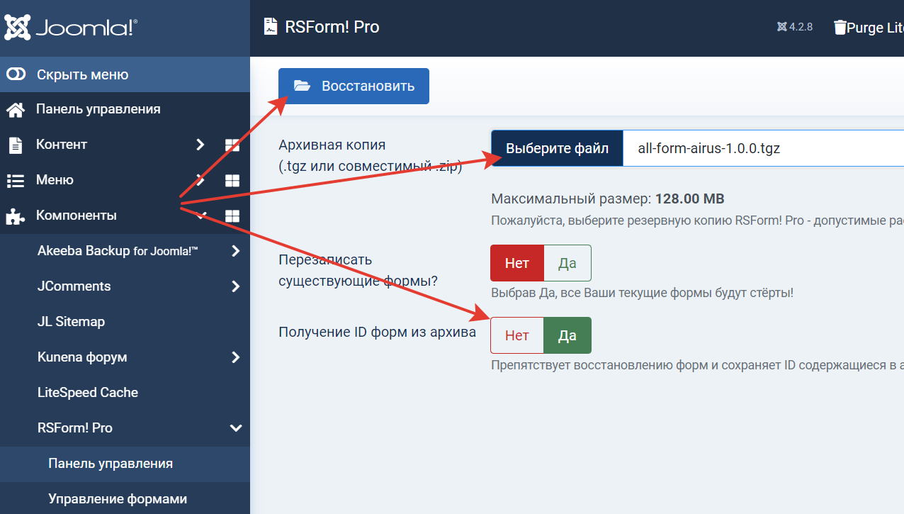 Далее переходим Компоненты/RS Form/Восстановление. Прикрепляем файл all-form-airus-1.0.0.tgz (файл находится в архиве с обновлением в каталоге all-form). Получение ID форм из архива ставим ДА. И нажимаем Восстановить. После этого нужно дождаться восстановления и все формы появятся в панели.