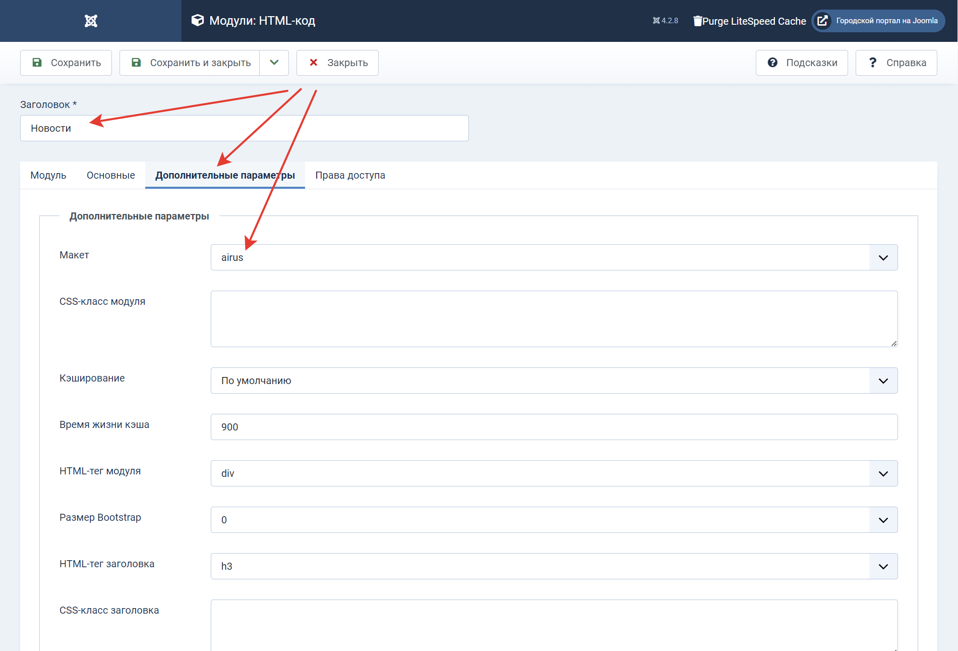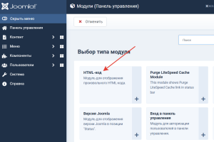 Для этого переходим Контент/Модули сайта, выбираем область Панель управления и создаем новый модуль с типом HTML, выбираем позицию menu, а на вкладке Дополнительные параметры выбираем макет airus.