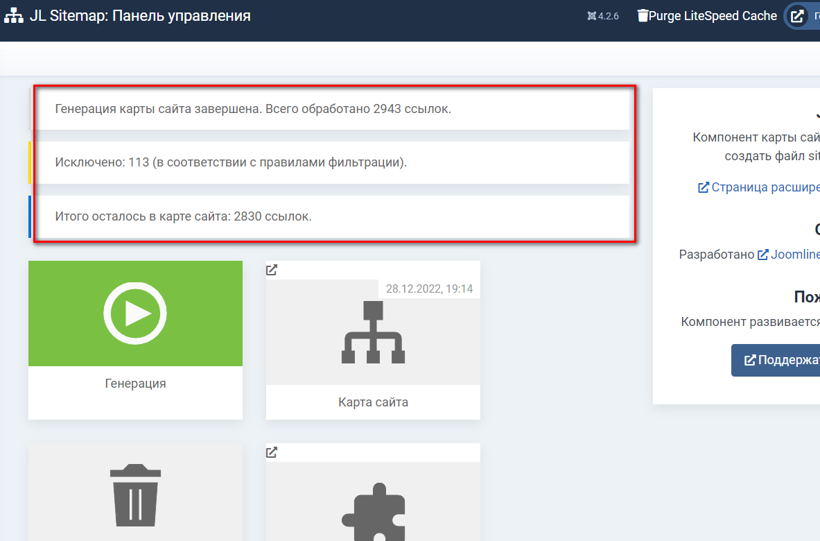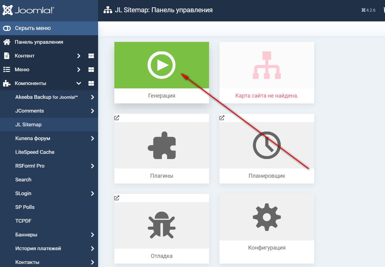 После того как Вы установили портал, карту сайта нужно создать. Для этого надо перейти Компоненты/JL Sitemap и нажать кнопку Генерировать. После этого будет создана карта Вашего сайта.