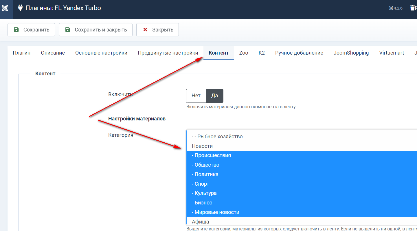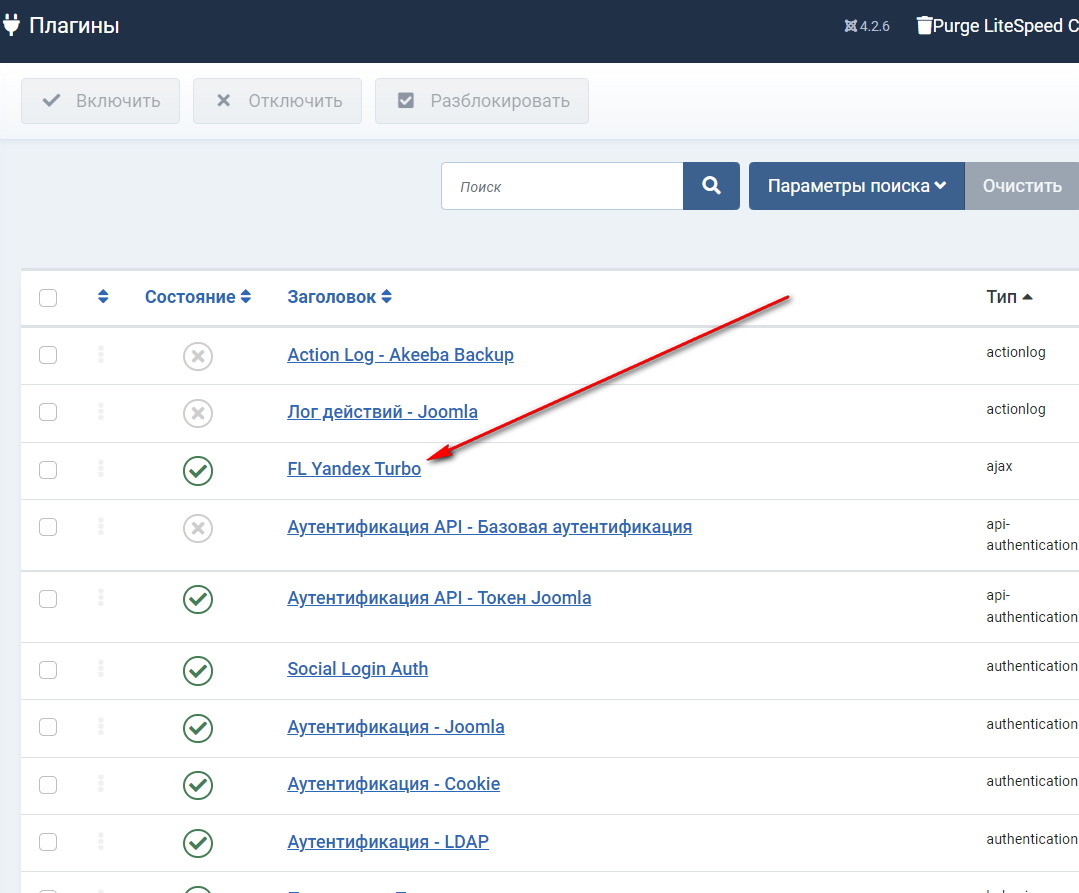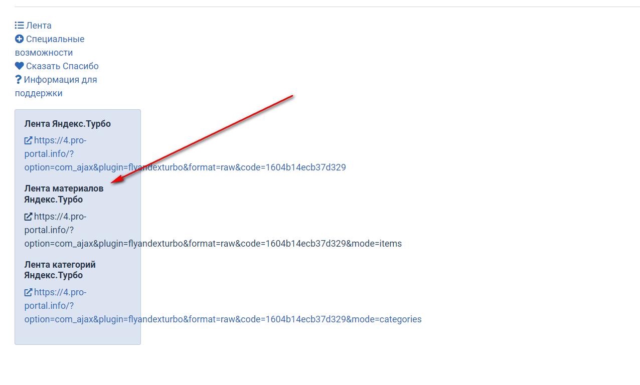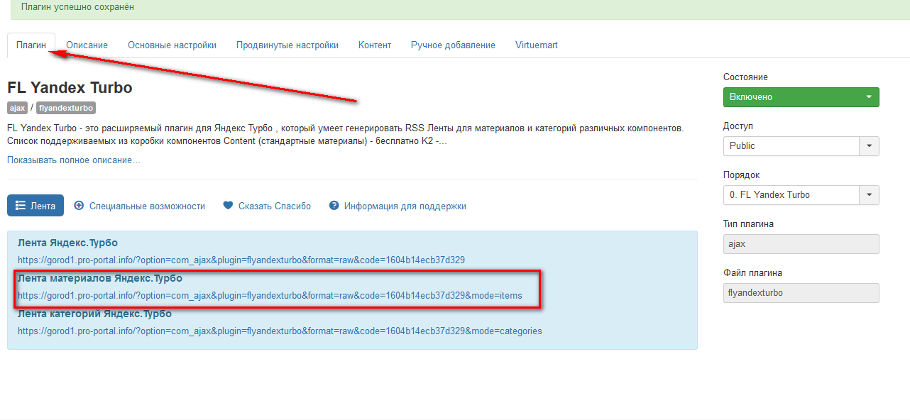 Для этого перейдем Система/Плагины. Откроем плагин FL Yandex Turbo. На первой вкладке видим ссылки - источники для добавления в вебмастер.