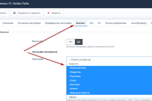 На вкладке Основные настройки пишем название сайта и описание сайта, далее на вкладке Контент выбираем категории, из которых нужно выводить материалы (я выбираю только Новости и Новости компаний). Эти материалы будут выводиться на странице поисковика