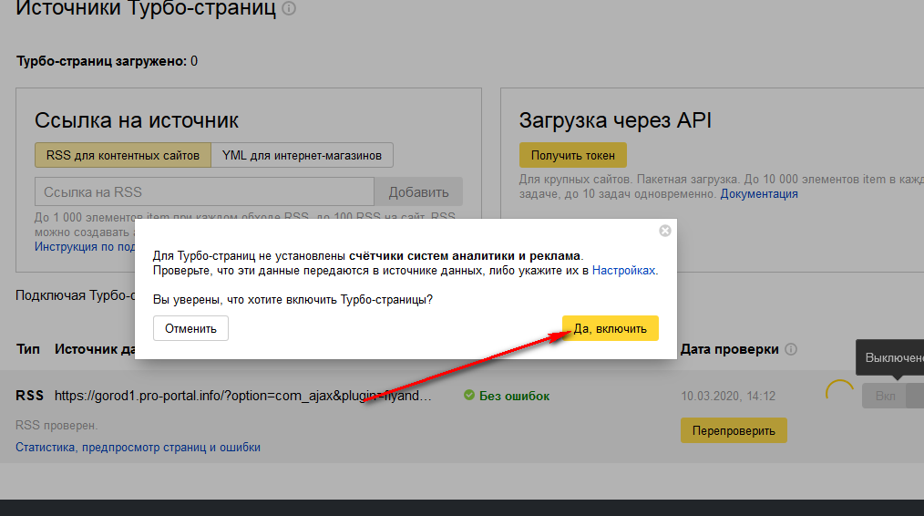 После того, как проверка пройдет успешно, Вам необходимо включить Турбо.Страницы и согласиться с условиями. После этого проверка пойдет еще раз. На этот раз она может занять до нескольких часов.