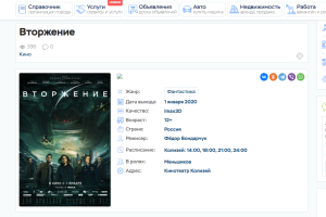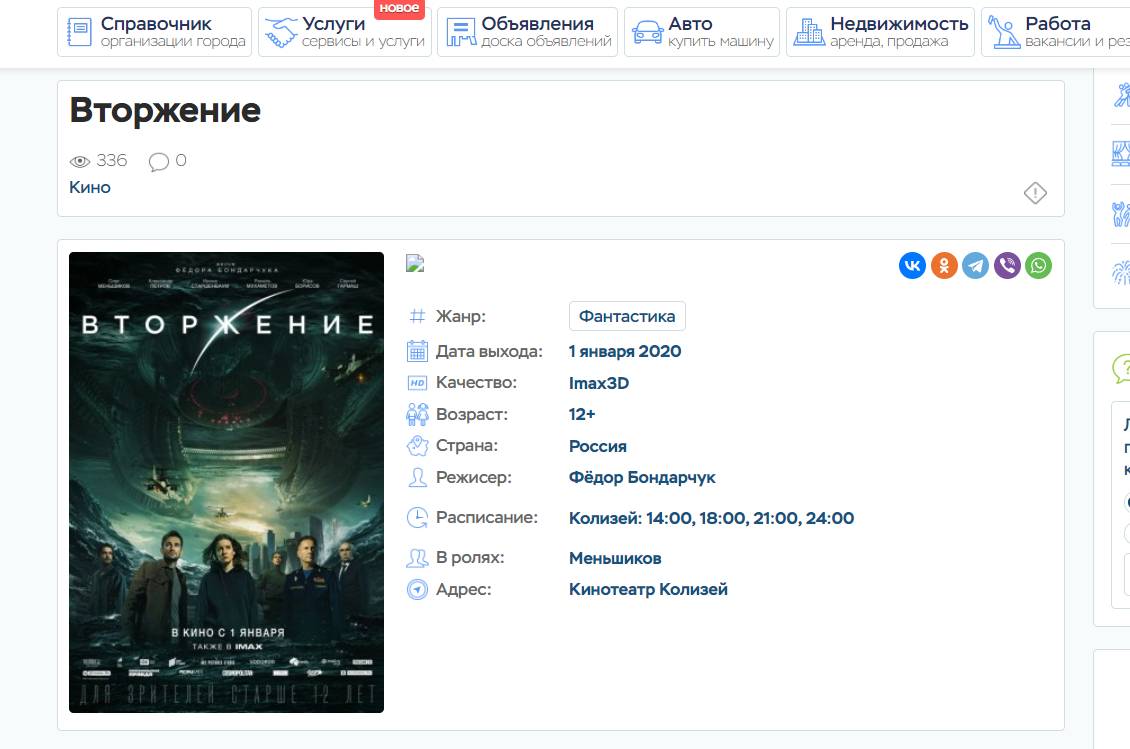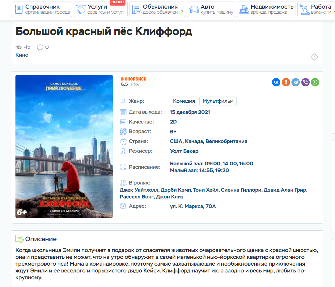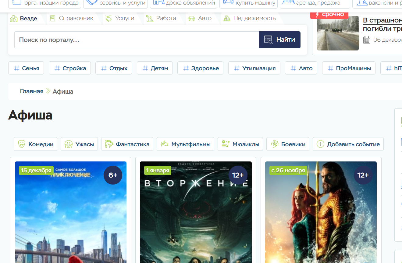 Афиша событий в нашем городском портале реализована, как обычный, самый простой, каталог объявлений о предстоящих премьерах, мероприятиях и событиях в городе.