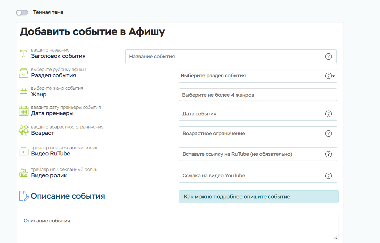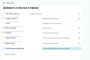 Любой зарегистрированный пользователь может добавить неограниченное количество событий в каталог Афиши, выбрав соответствующий раздел в каталоге событий и добавив до 4 жанров, а также фото или обложку.