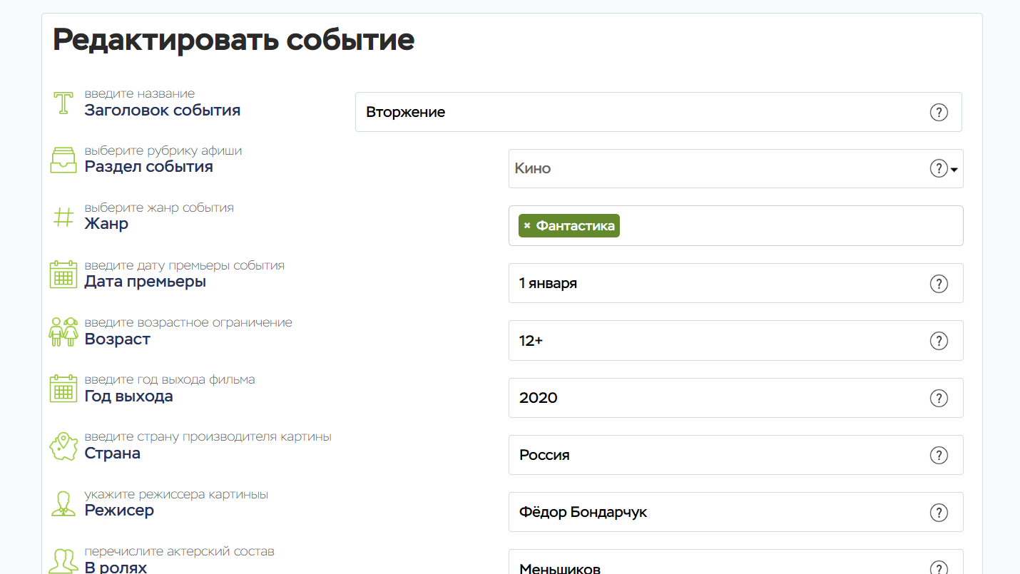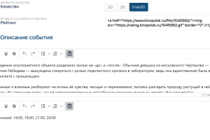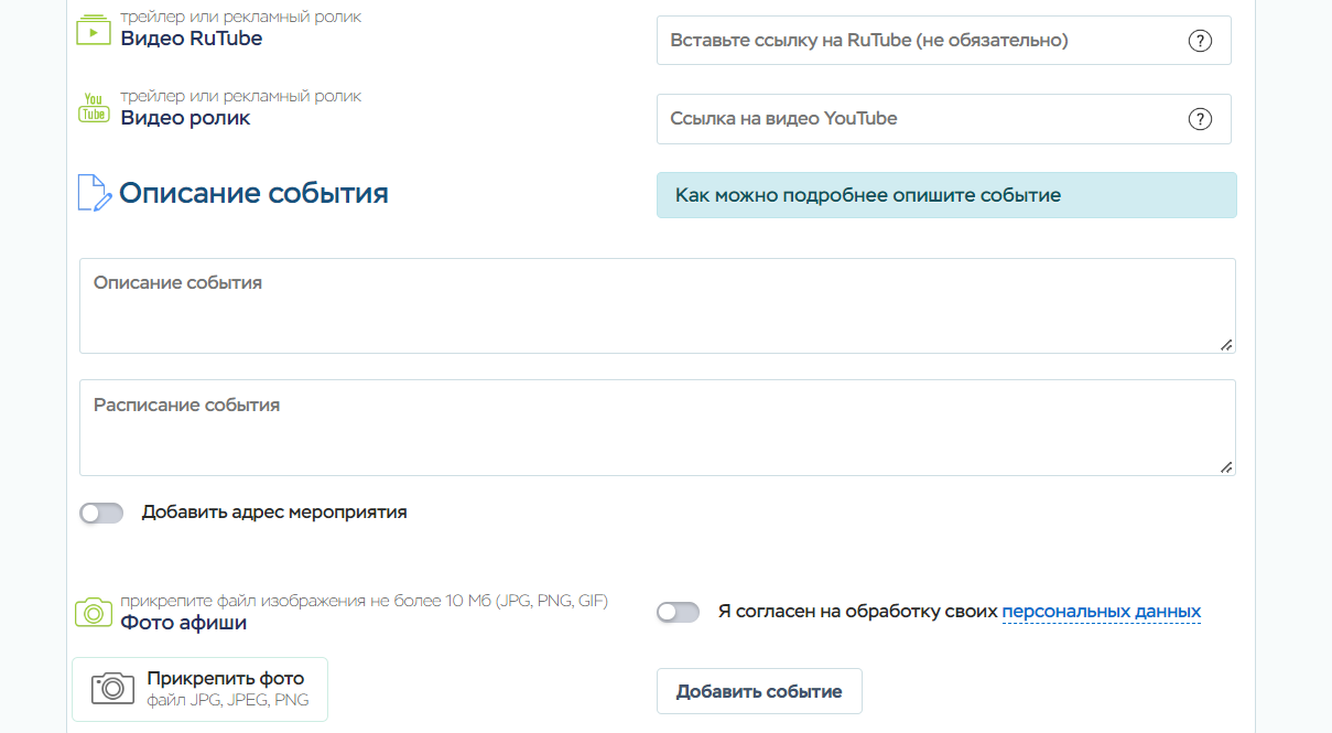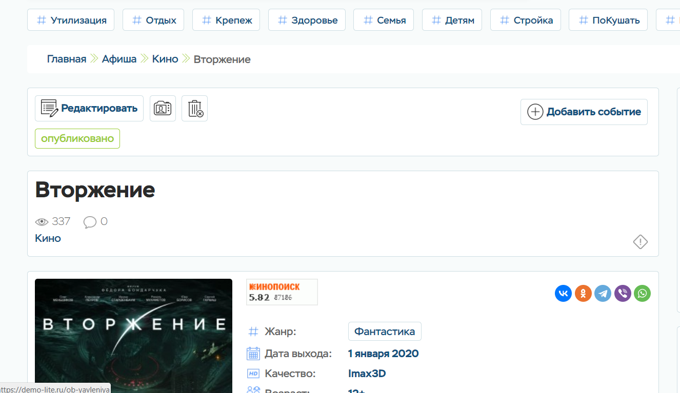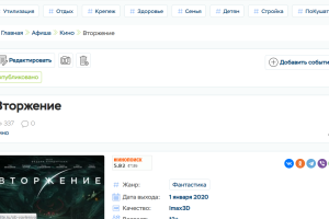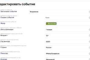 Премодерация каждого добавленного события не является обязательной. Отключить модерацию можно в настройках порталаКаждое событие афиши содержит следующую информацию