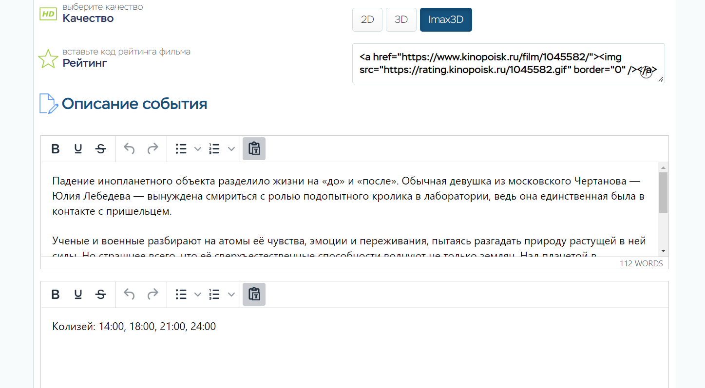 Все события добавляются только вручную и только из форм добавления на сайте. Парсинга или импорта в портале не предусмотреноВозможности для редактирования событий афиши