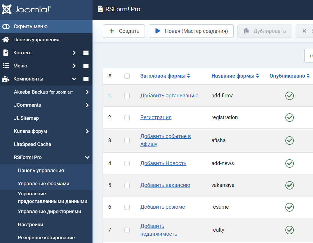 Разделы событий Афиши - это категории материалов Joomla, а сами события - это материалы Joomla.
