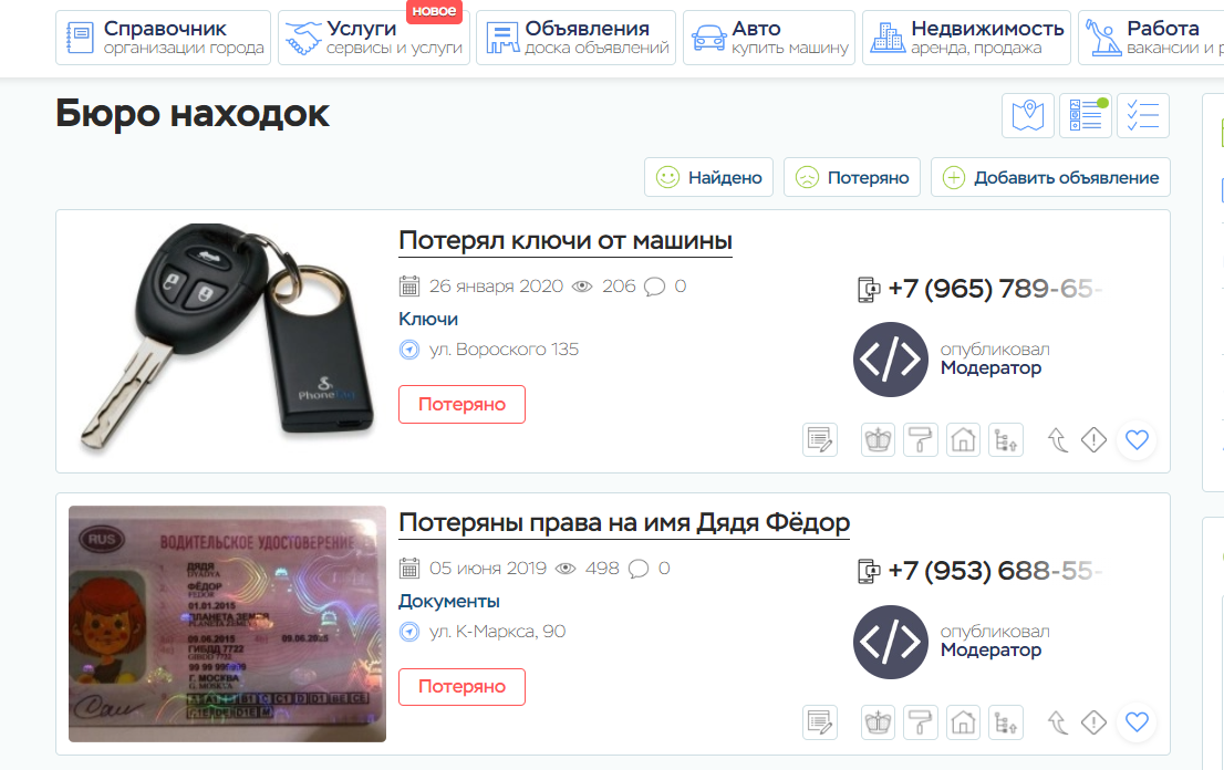 Раздел Бюро находок (Потеряшки) в городском портале "мой Город" предназначен для размещения пользователями объявлений о своих находках или пропажах. Пользователи могут разместить объявления о находке или пропаже своих вещей, документов или животных
