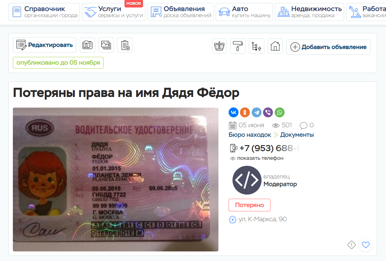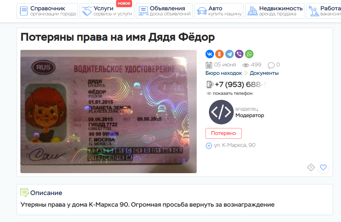 - Телефон владельца или нашедшего