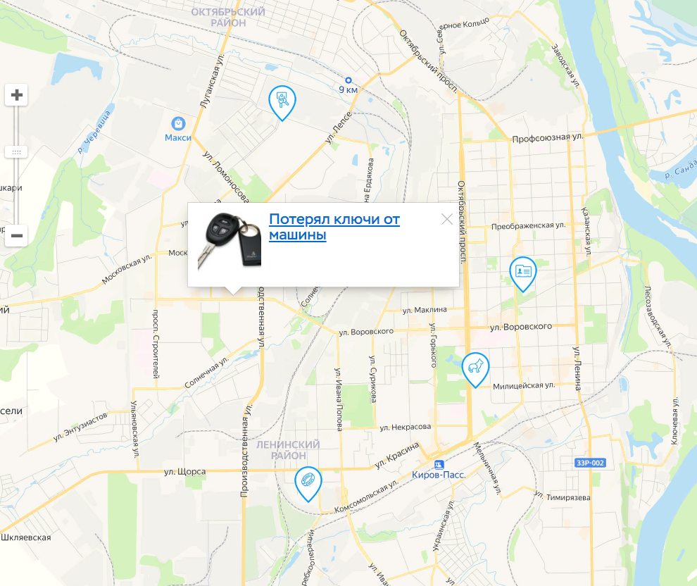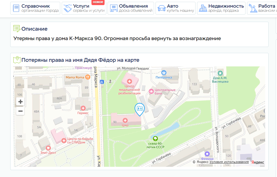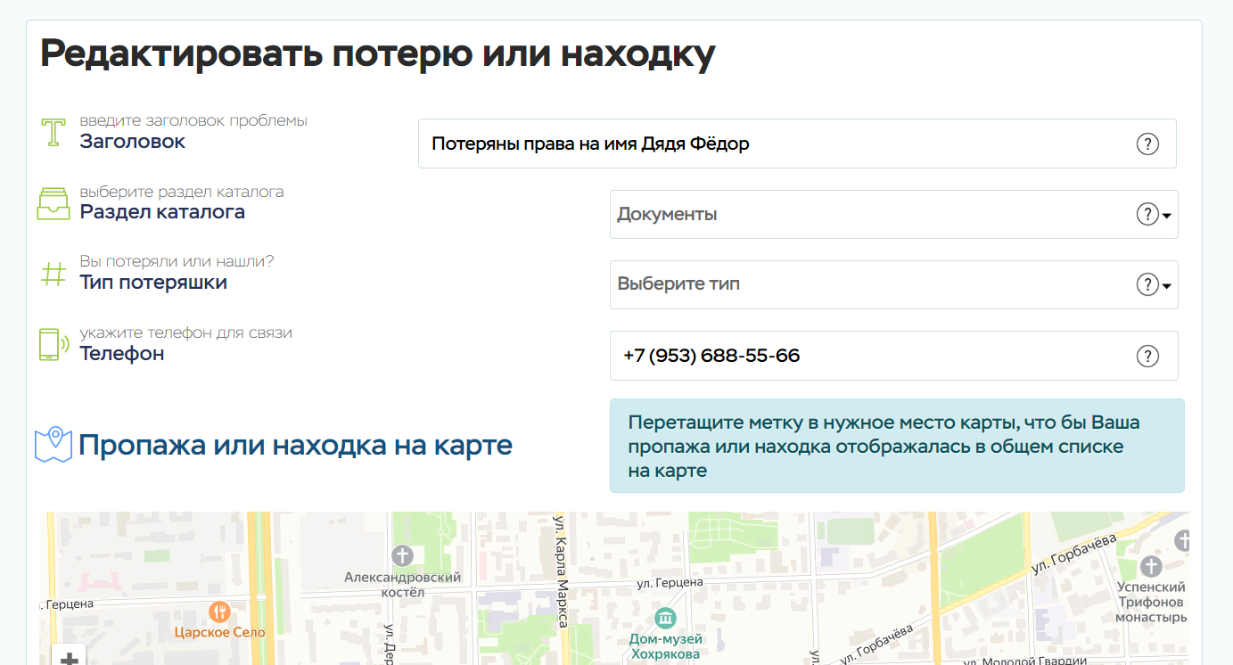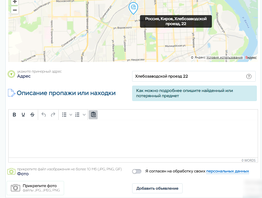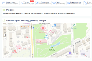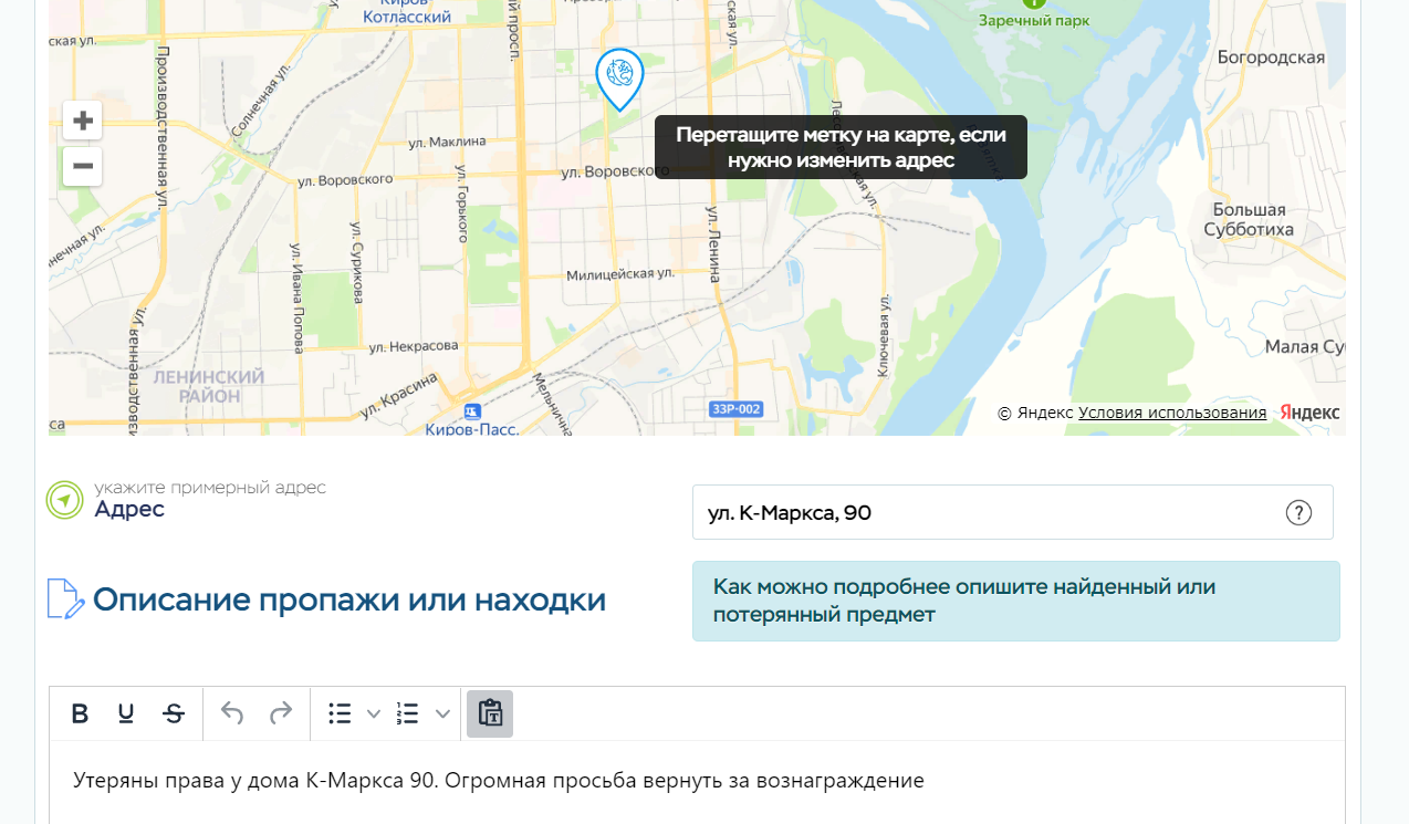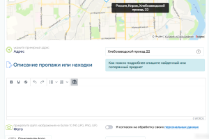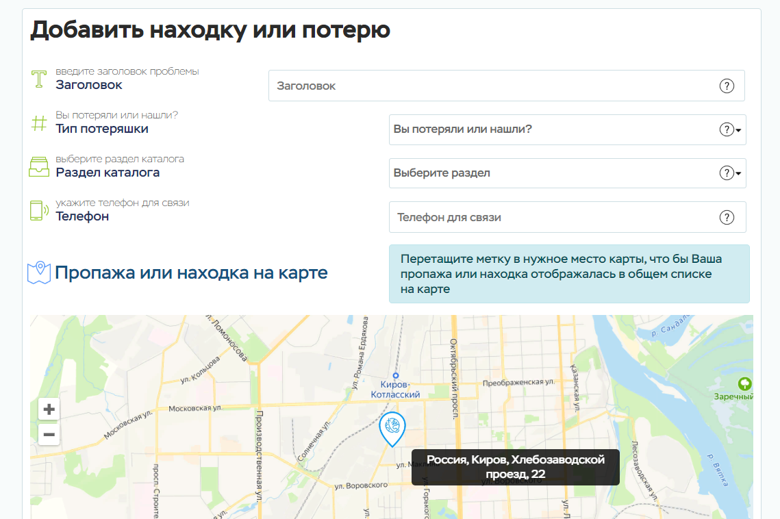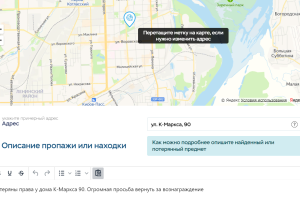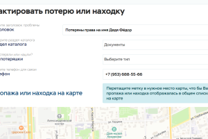 Каждый зарегистрированный пользователь имеет возможность добавить неограниченное количество объявлений о своих пропажах или находках, выбрав соответствующий раздел в форме добавления, а так же поставив метку с адресом на карте (Яндекс.Карты)