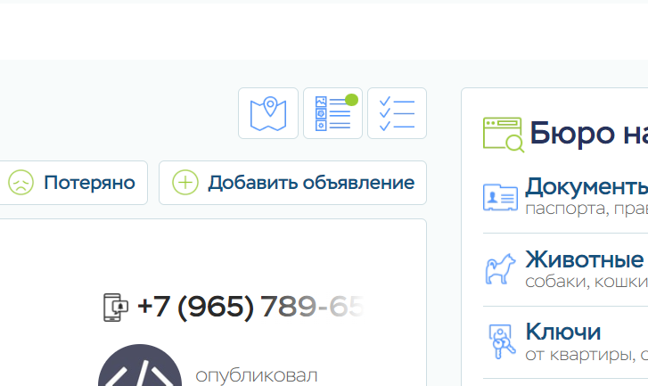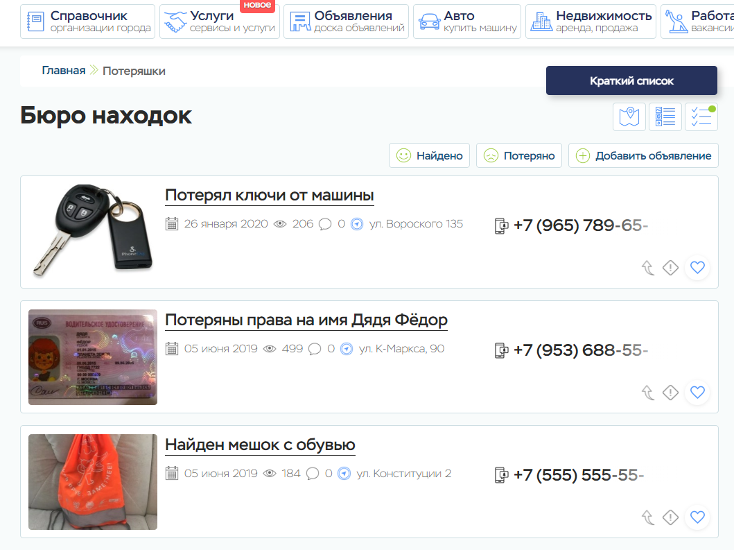 В общем списке находок и потерь все пользователи могут просматривать карту всех объявлений или менять расположение объявлений на странице: краткий и подробный