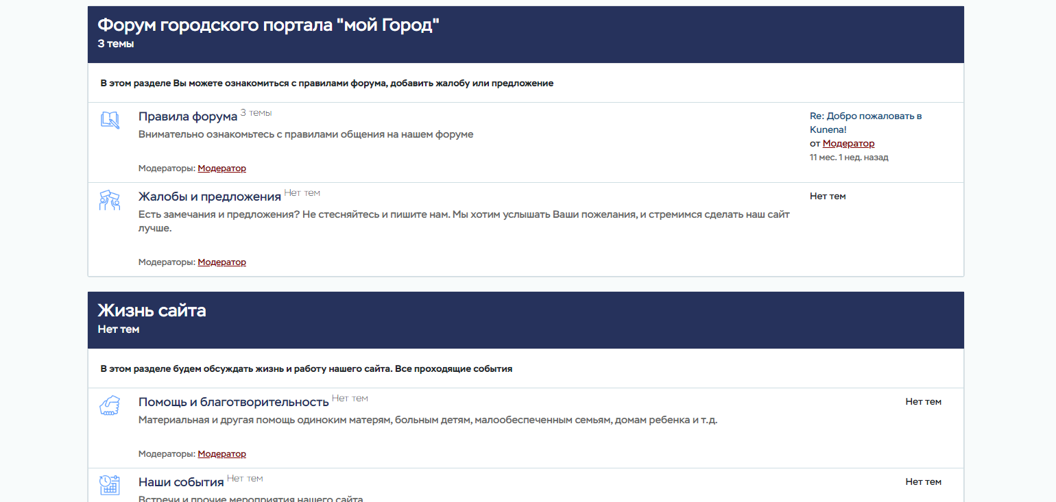 Форум городского портала "мой Город" - это полноценное сообщество для общения посетителей портала, где пользователи смогут общаться друг с другом, высказывать мнения и жалобы. Форум полностью интегрирован в портал и не требует дополнительной регистрации, что очень удобно.
