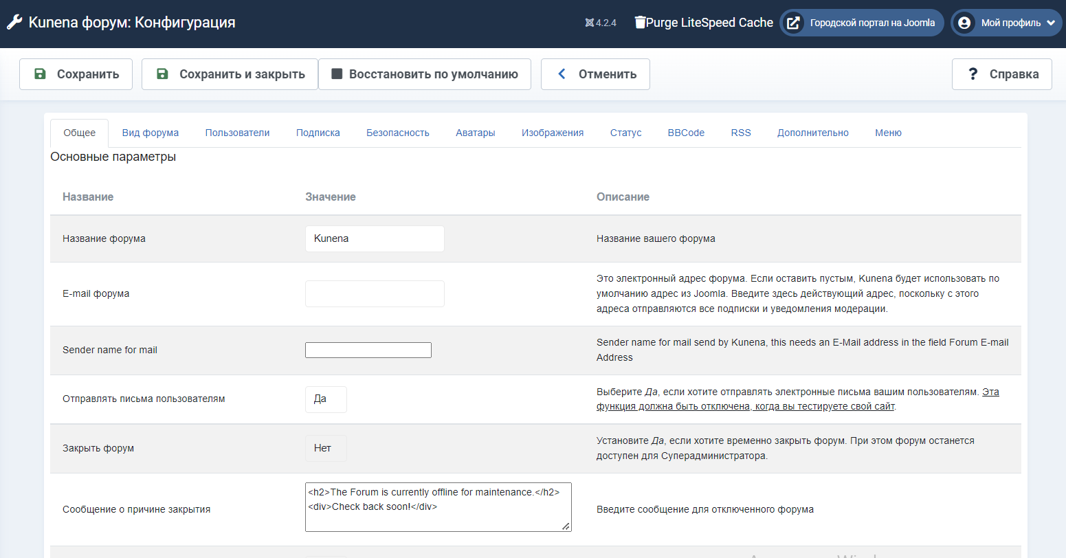 Раздел форума в городском портале "мой Город" реализован с помощью стороннего и бесплатного компонента Kunena. В системе управления Joomla он находится Компоненты/Kunena