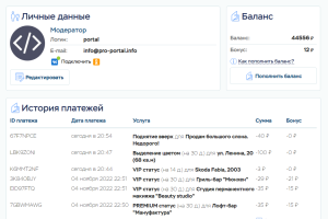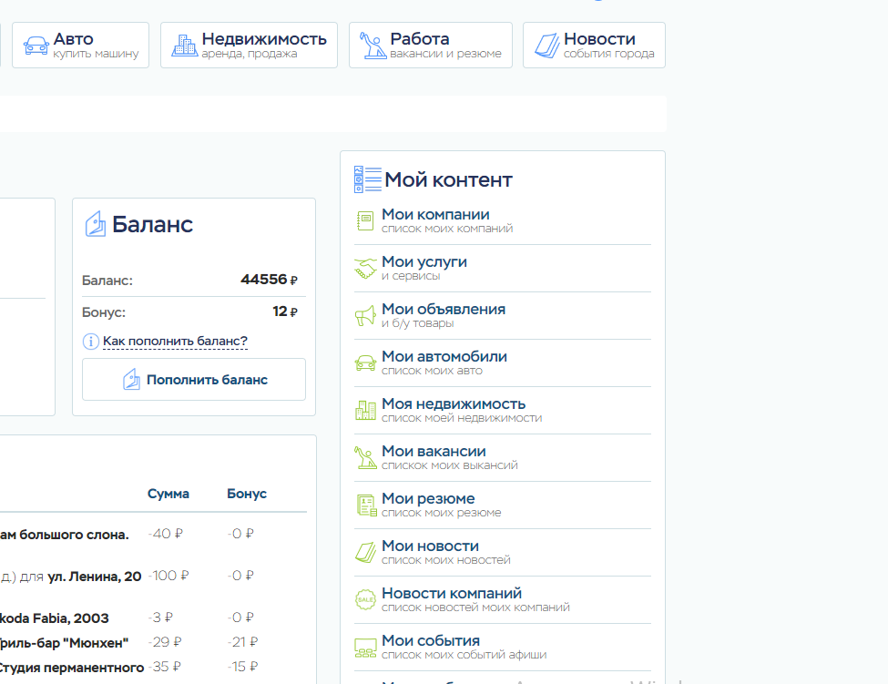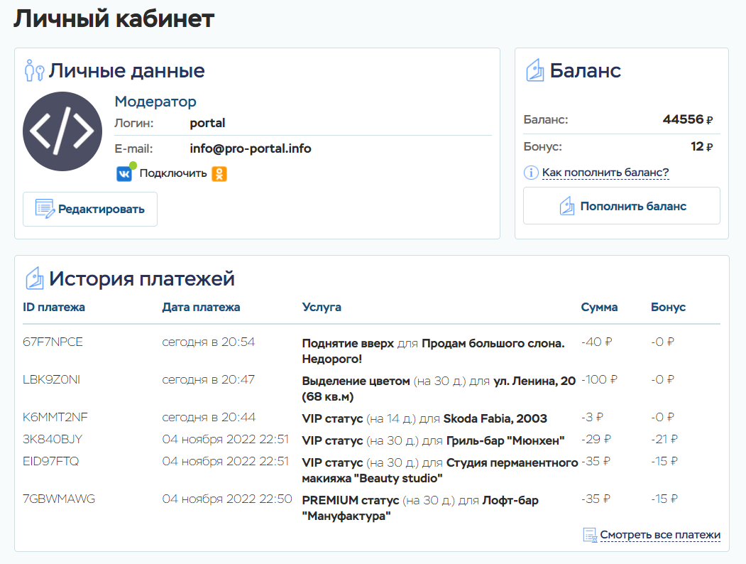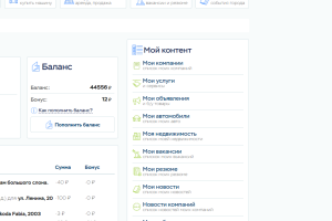 У каждого пользователя портала есть личный кабинет, в котором есть все необходимое для использования портала. В личном кабинете можно видеть все свои объявления, организации, новости и статьи, возможно изменить личные и контактные данные, а так же аватар. И, конечно же, есть возможность пополнить баланс и редактировать свои объявления и компании