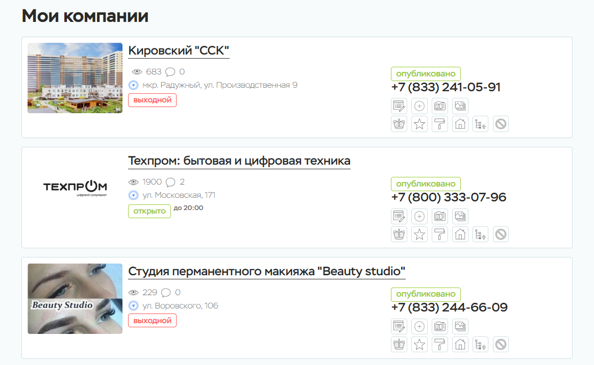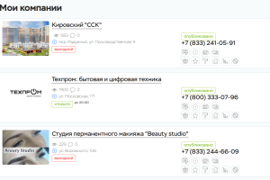 Из личного кабинета пользователь может редактировать, добавлять и удалять все свои компании и объявления, статьи и вопросы, новости и проблемы, а в целом любой контент, который был добавлен пользователем на страницы портала.