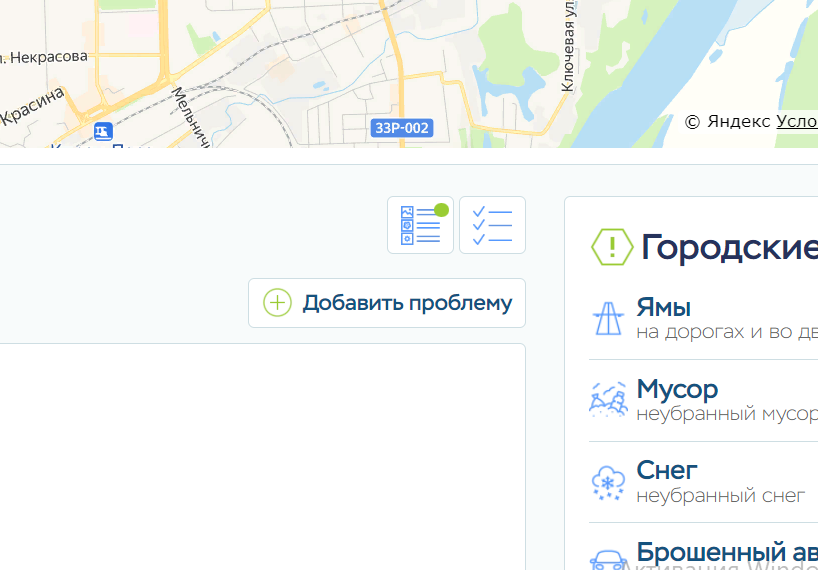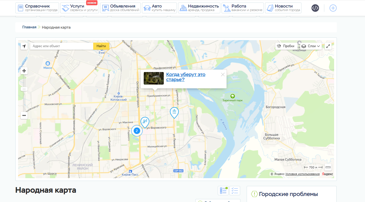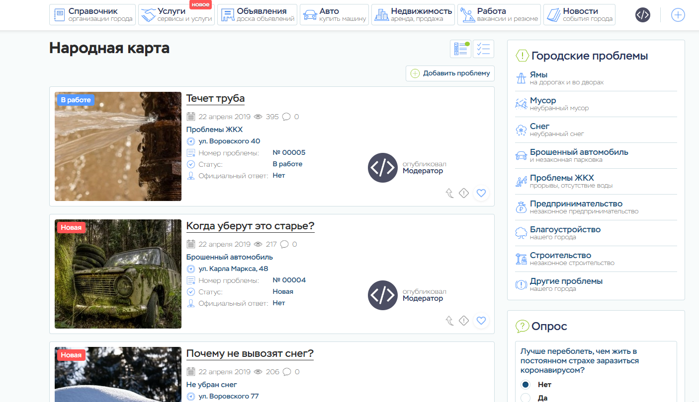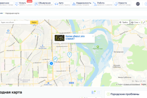 Народная карта в нашем городском портале представляет собой каталог проблем города, которые пользователи добавляют самостоятельно. Помимо общего списка, в разделе есть карта, где так же представлены все проблемы. Каждый пользователь может добавить неограниченное количество проблем города.