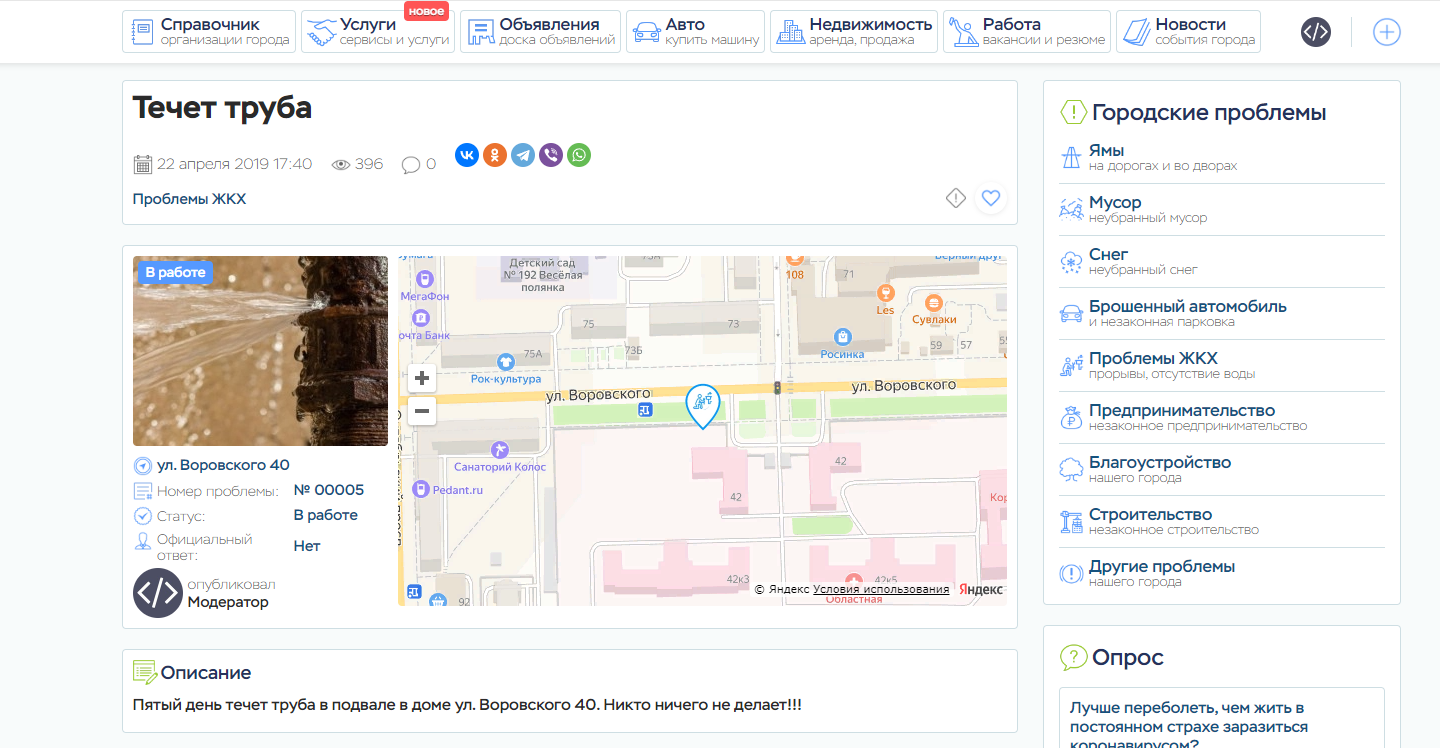 Каждый пользователь городского портала может разместить на его страницах любую городскую проблему, которая его волнует. Все проблемы отображаются на карте города и имеют свою страницу, где указан статус проблемы и официальный ответ на нее