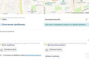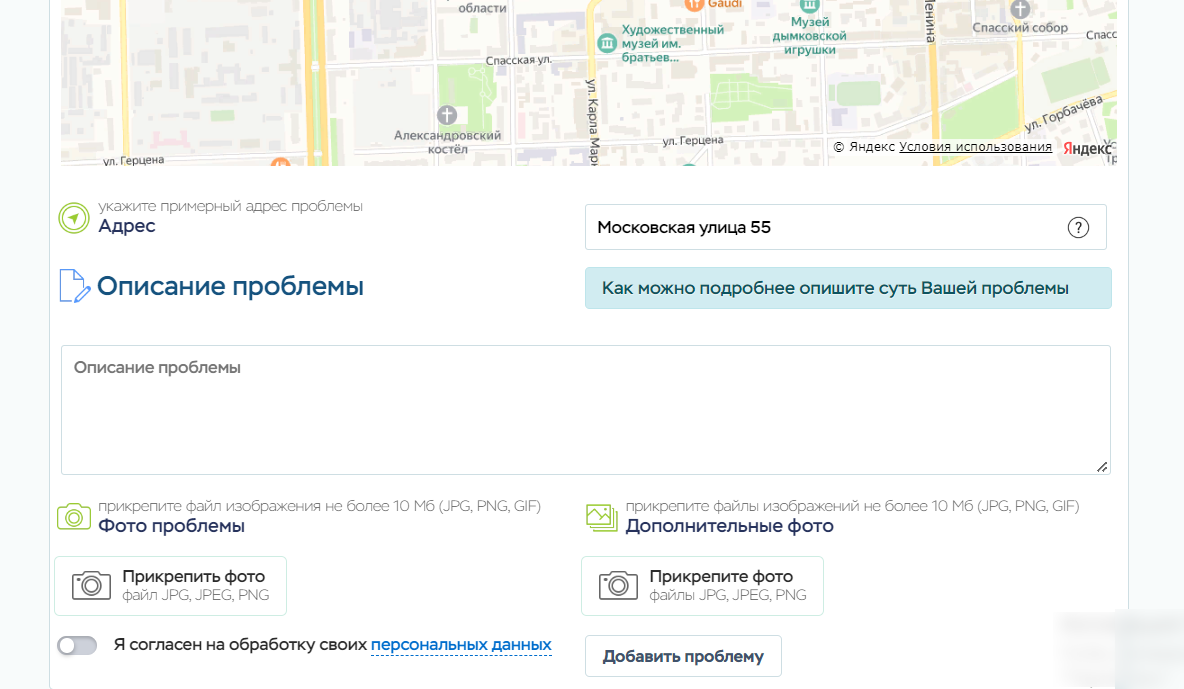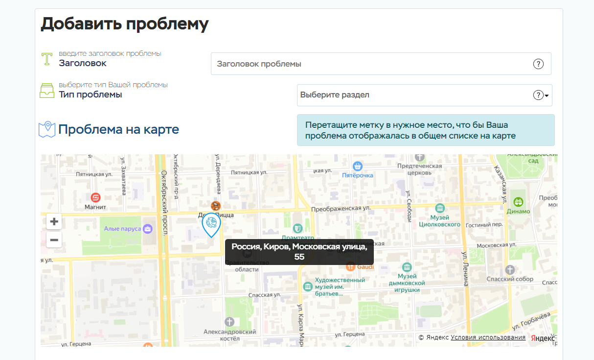 Каждый зарегистрированный пользователь может добавить неограниченное количество городских проблем через специальную форму добавления, предварительно выбрав раздел проблемы, и, обозначив проблему точкой на карте.