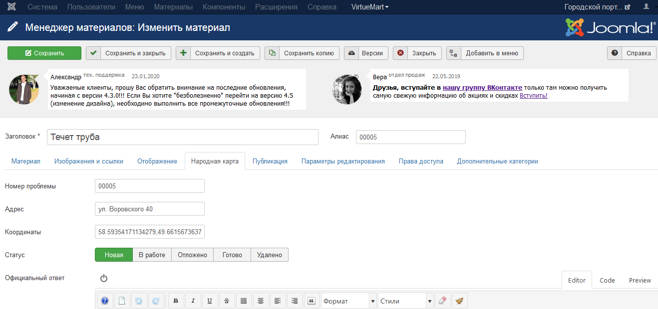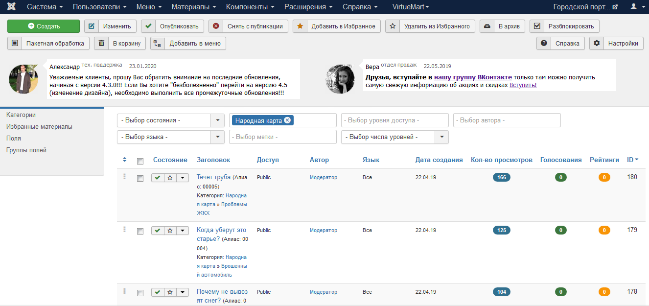 Народная карта (Каталог проблем города) в нашем городском портале реализована с помощью стандартных возможностей системы управления CMS Joomla, без использования дополнительных компонентов и расширений.