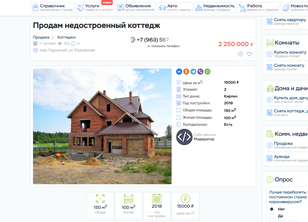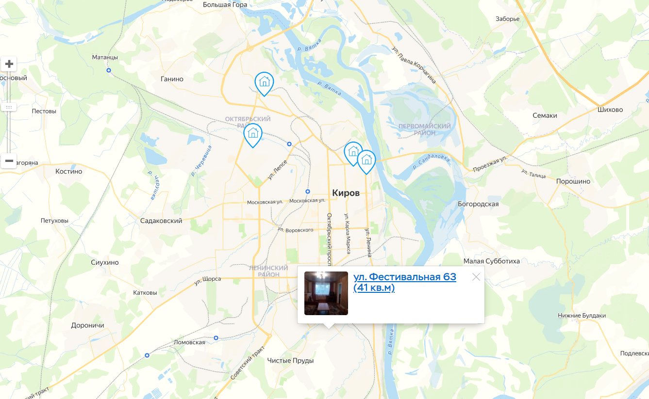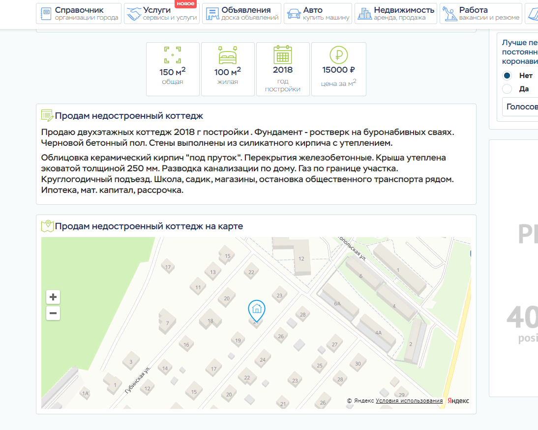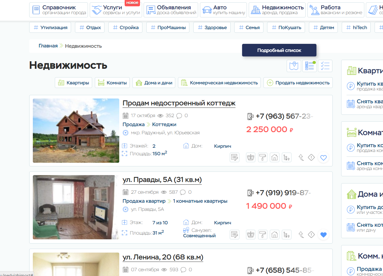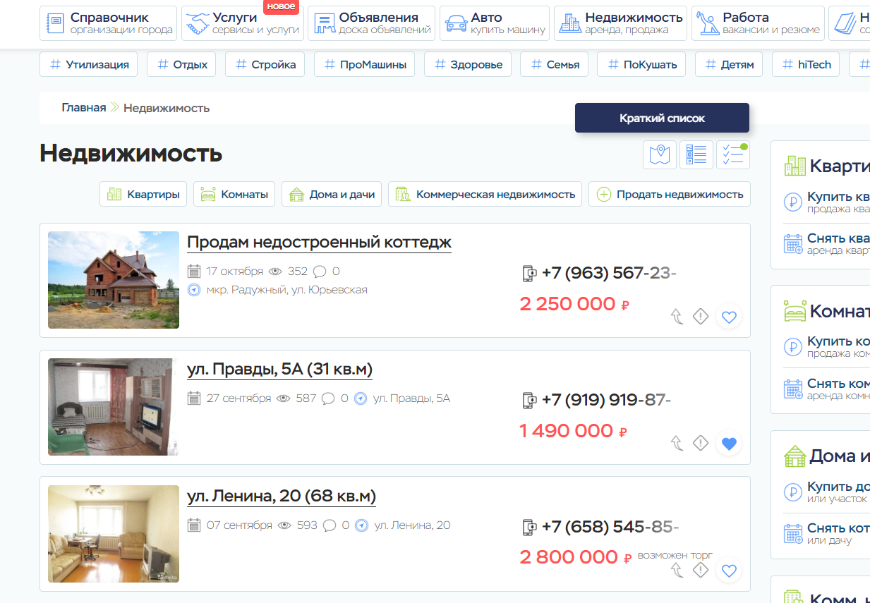 Премодерация каждого добавленного объявления не является обязательной. Отключить модерацию можно в настройках порталаВ общем списке объявлений о продаже или аренде недвижимости имеется возможность посмотреть карту всех объектов выбранной категории недвижимости. Так же пользователь, для своего удобства, может менять вид каталога на краткий и подробный.