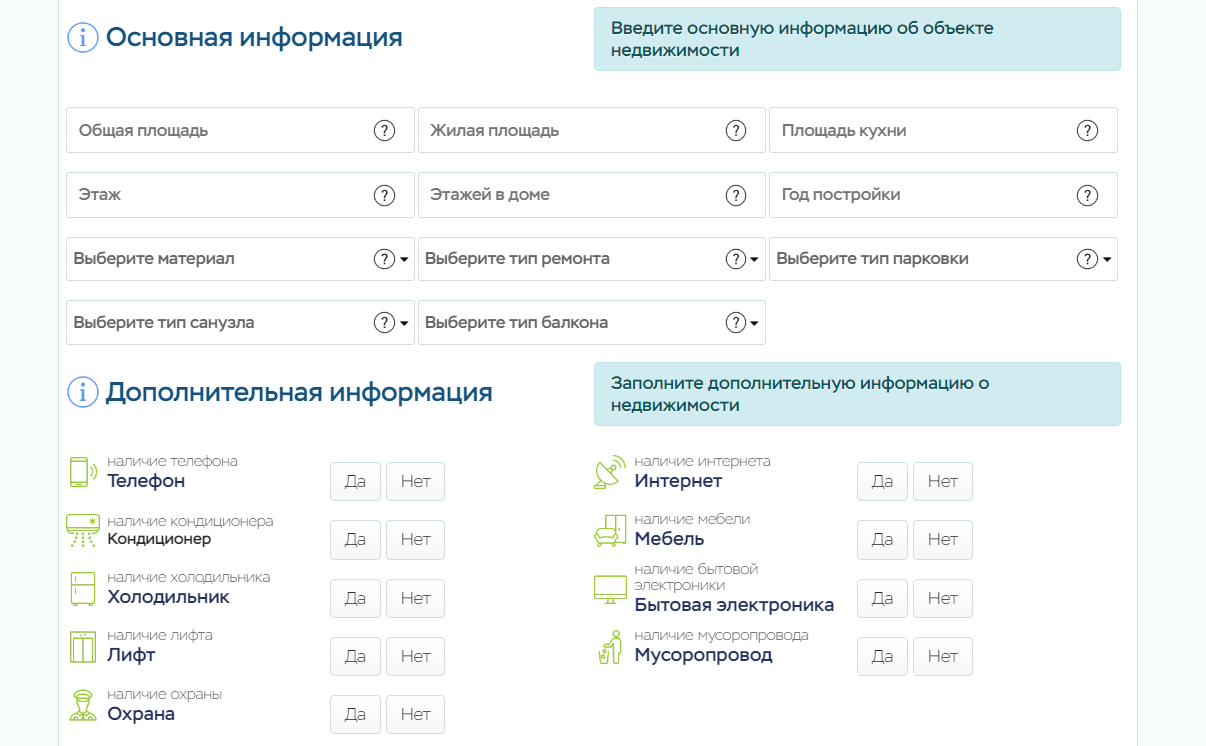 Все объявления добавляются только вручную и только из форм добавления на сайте. Парсинга или импорта в портале не предусмотреноВозможности для редактирования недвижимости