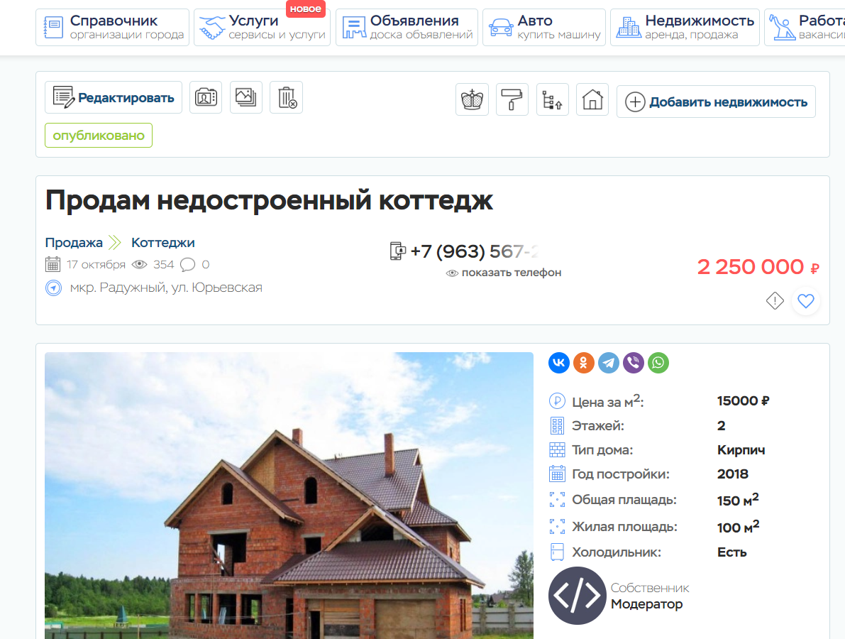 У каждого пользователя есть возможность редактировать свои объекты недвижимости, либо удалять их. Делать это, пользователь может или из личного кабинета, или со страницы своего объекта.
